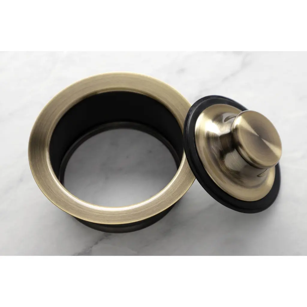 Easy to install and able to fit above most garbage disposal openings, the Made To Match garbage disposal flange keeps unwanted items from clogging your drain. The available premium finish options puts the finishing touches on your kitchen design as you can coordinate the disposal flange with your faucet.FeaturesHigh quality brass construction for durability and reliabilityFits most standard garbage disposable unitsIncludes disposable flange and stopperFits sink with 3-1/2" drain openingHeight: 1-3/4"4-1/2" top rim diameterEasy installationCorrosion-resistant finish