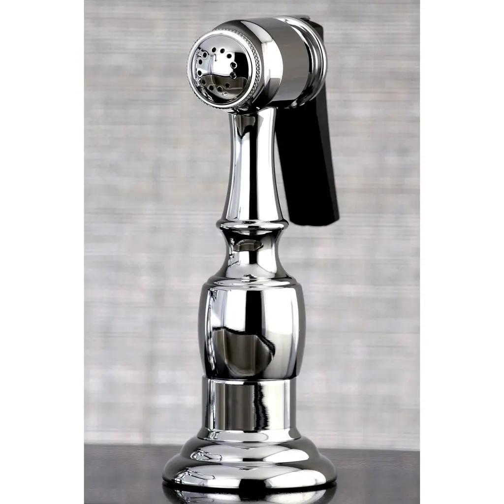The Kingston Brass kitchen side spray, constructed of brass, can be used to replace or in select instances upgrade or update your kitchen faucet's existing side spray. This item can only be used with side spray compatible faucets and should not be installed in alternate configurations. Available in multiple finishes to match your faucet. Includes 60" grey hose sheathed in braided PVC for durability and cleaning chemical resistance.FeaturesHigh quality brass and PVC construction2-1/8" shank height fit to most countertopIncludes 60-inch grey braided PVC hose1/4-18 NPS connectionSingle spray functionEasy-to-use one-touch button operationCorrosion-resistant finishDesigned for long-lasting durabilityTo be used as a replacement for an existing side spray on a compatible kitchen faucetNever to be installed directly to a supply line, stop valve or other continuous pressure sourceProp 65 disclaimerWARNING: This product can expose you to chemicals, including lead which is known to the State of California to cause cancer or birth defects or other reproductive harm, for more information, go to www.p65warnings.ca.gov