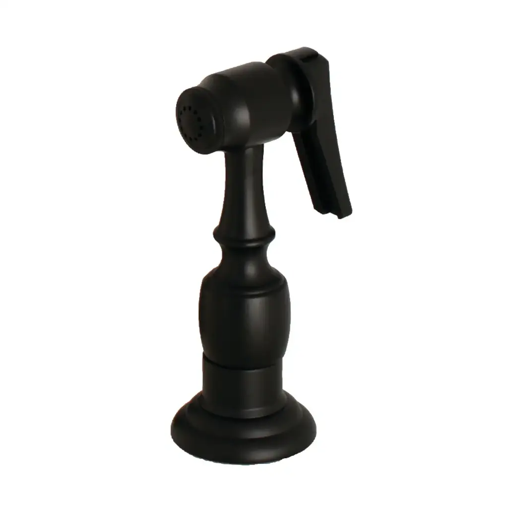 The Kingston Brass kitchen side spray, constructed of brass, can be used to replace or in select instances upgrade or update your kitchen faucet's existing side spray. This item can only be used with side spray compatible faucets and should not be installed in alternate configurations. Available in multiple finishes to match your faucet. Includes 60" grey hose sheathed in braided PVC for durability and cleaning chemical resistance.FeaturesHigh quality brass and PVC construction2-1/8" shank height fit to most countertopIncludes 60-inch grey braided PVC hose1/4-18 NPS connectionSingle spray functionEasy-to-use one-touch button operationCorrosion-resistant finishDesigned for long-lasting durabilityTo be used as a replacement for an existing side spray on a compatible kitchen faucetNever to be installed directly to a supply line, stop valve or other continuous pressure sourceProp 65 disclaimerWARNING: This product can expose you to chemicals, including lead which is known to the State of California to cause cancer or birth defects or other reproductive harm, for more information, go to www.p65warnings.ca.gov