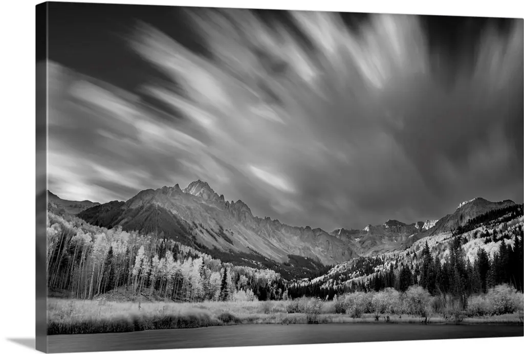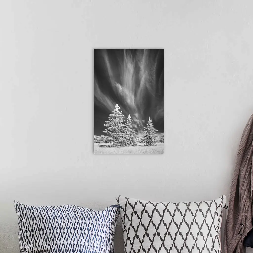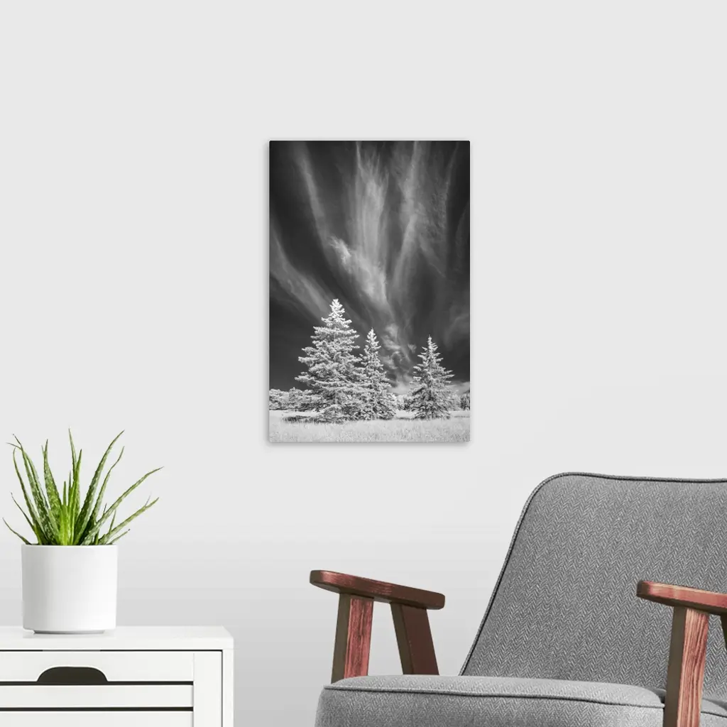Infrared photo of pine trees under a dark sky with wispy clouds on Madeline Island, Wisconsin.