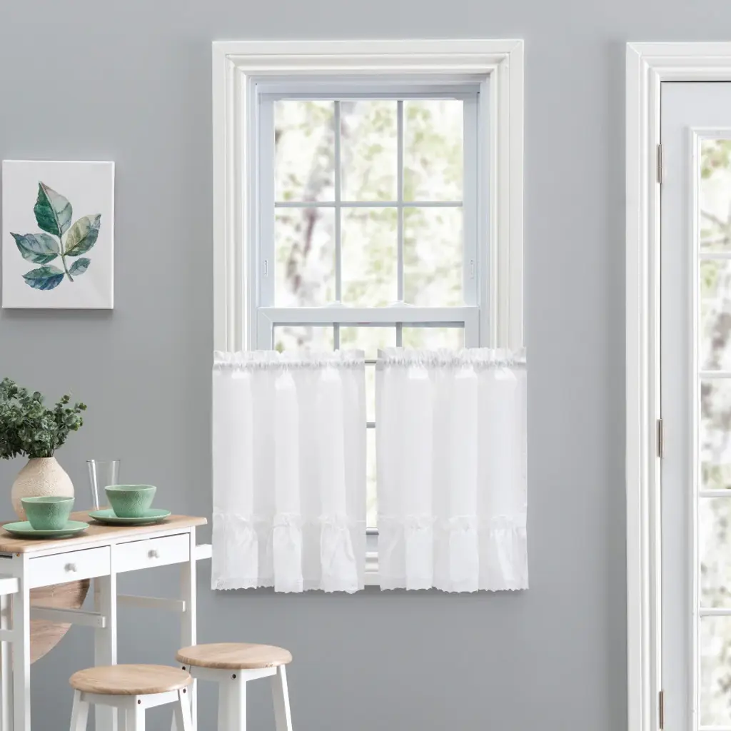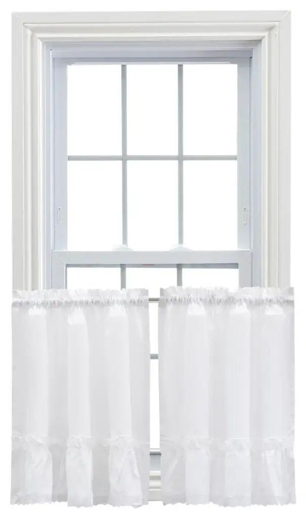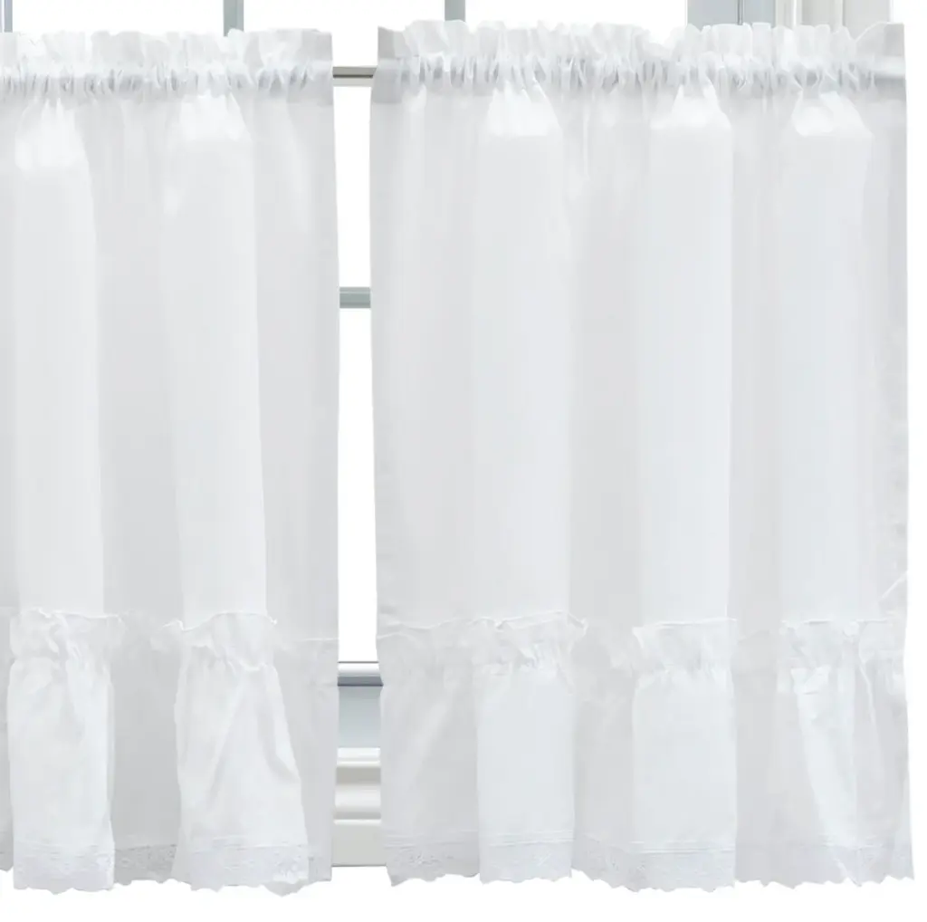 Add a light-hearted farmhouse touch to your home with layered ruffles in a soft pallet with will only enhance your décor. A semi-sheer mix of polyester and cotton will let light and fresh air flow through the room, while providing privacy. Trimmed with a beautiful lace. Ruffled Victorian tiers measure 82-inches wide (both 41-inch tiers together) and 45-inches in length. Made with a 1.5-inch rod pocket and 1-inch header. Handcrafted in the USA. Easy care machine washable.