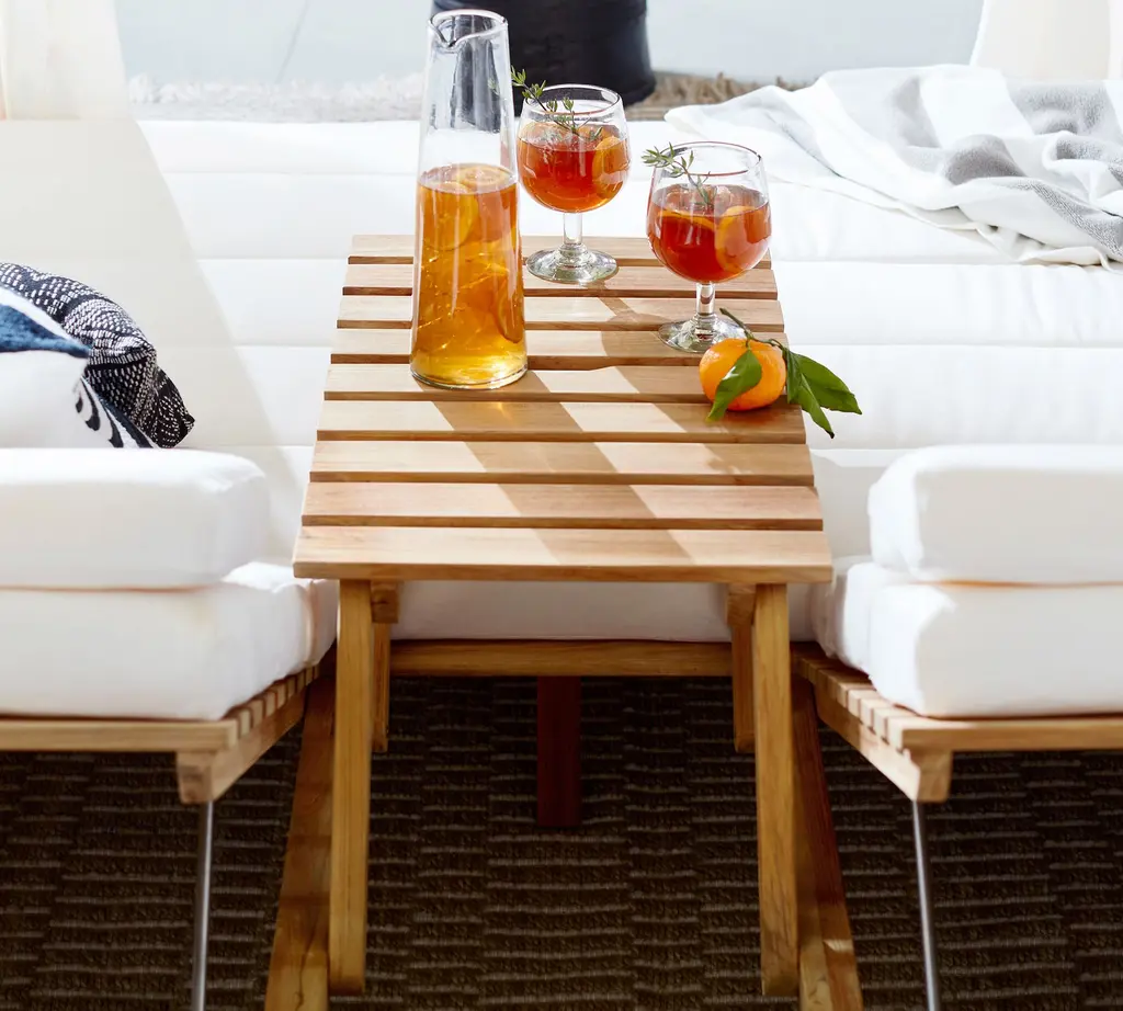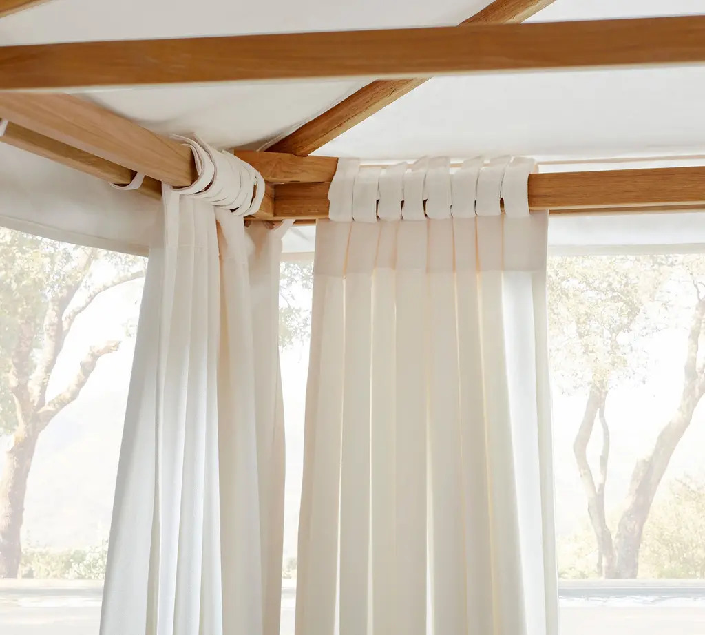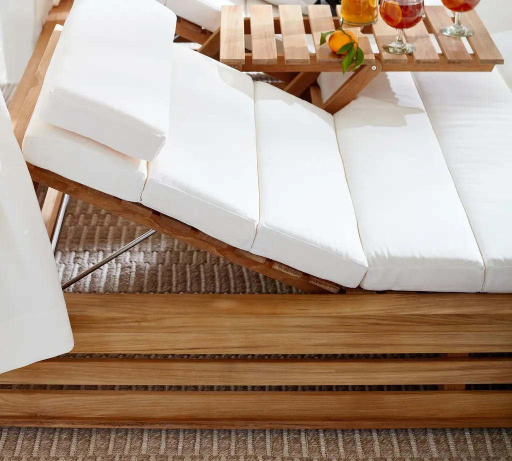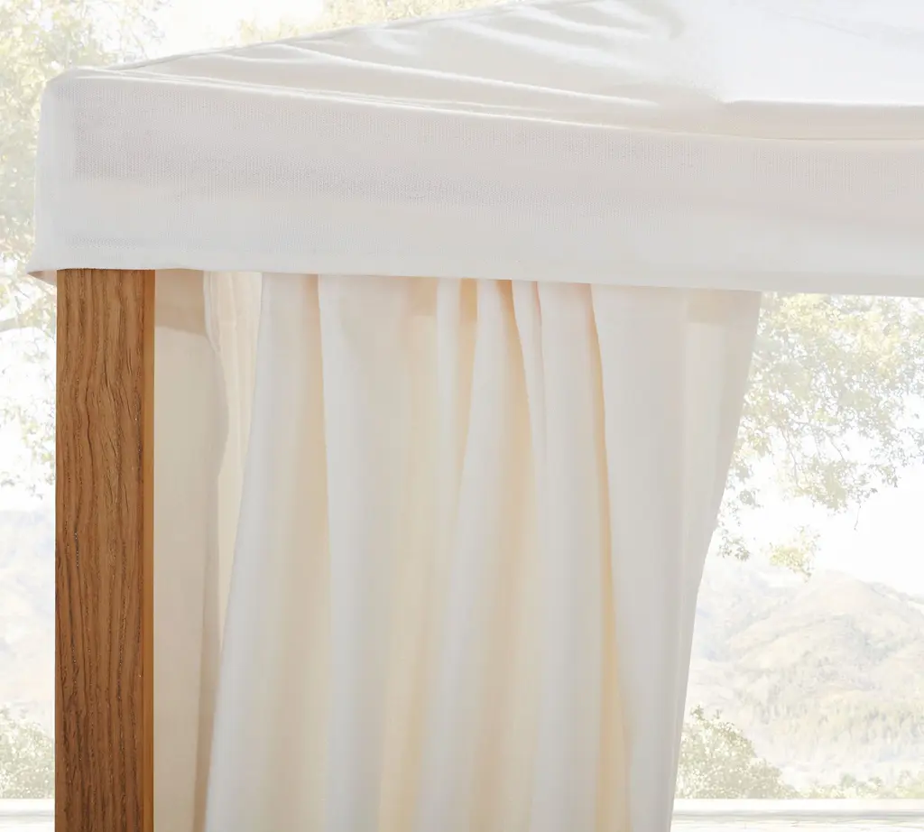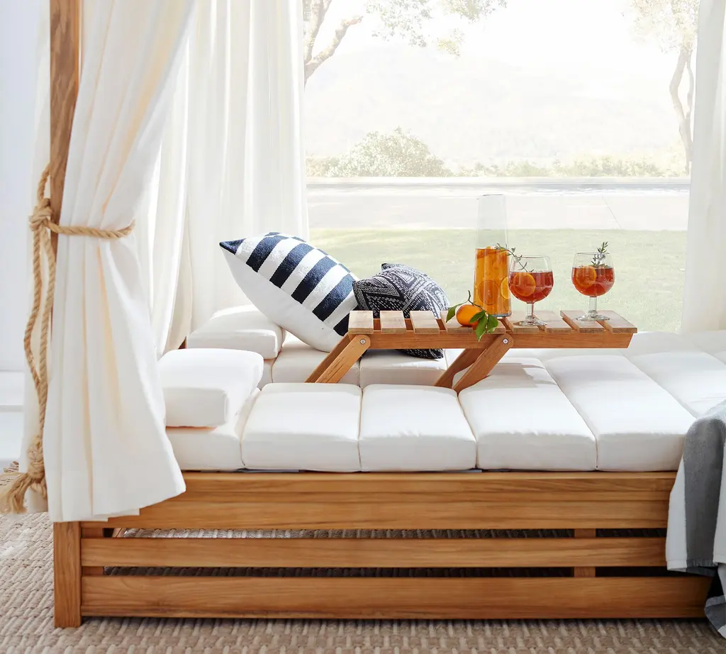 Luxuriously laid-back, Madera was inspired by the 19th-century Morris chair. Crafted from supremely weather-resistant teak, the collection elevates the casual look of wood slat construction. Rich details include generous proportions, lush wood grain, and planked wood framed by smooth edges. Our sumptuous daybed has a romantic canopy, individually adjustable loungers, channel-tufted cushions, and a folding tabletop.
