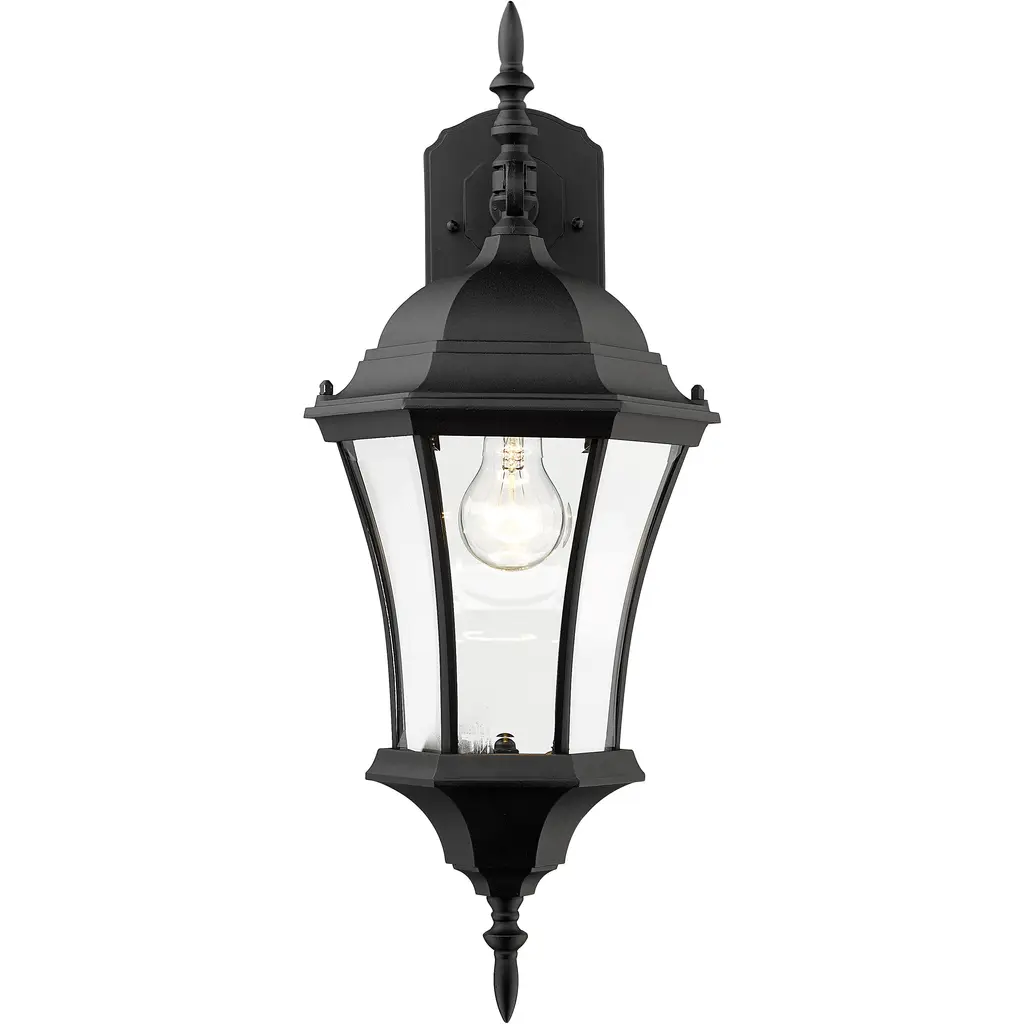 With its timeless colonial profile, the Madison is the perfect line of outdoor fixtures for those looking to embellish classic sophistication. Because it is made from cast aluminum and comes in an extensive amount of different finishes, this Madison 1-light wall lantern can go with any home decor while being able to withstand the elements. It features a Black finish with clear beveled glass panels. The Madison wall lantern uses a 100-watt (max.) bulb, measures 8in.in. wide by 13in.in. high, and is U.L. listed for wet location.