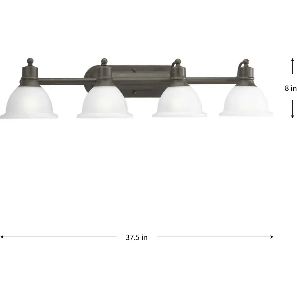 Antique Bronze Four-light wall bracket with white etched glass. Glass in a clean, simple domed shape provides even, diffused illumination. Fixture can be installed facing upwards or downwards.