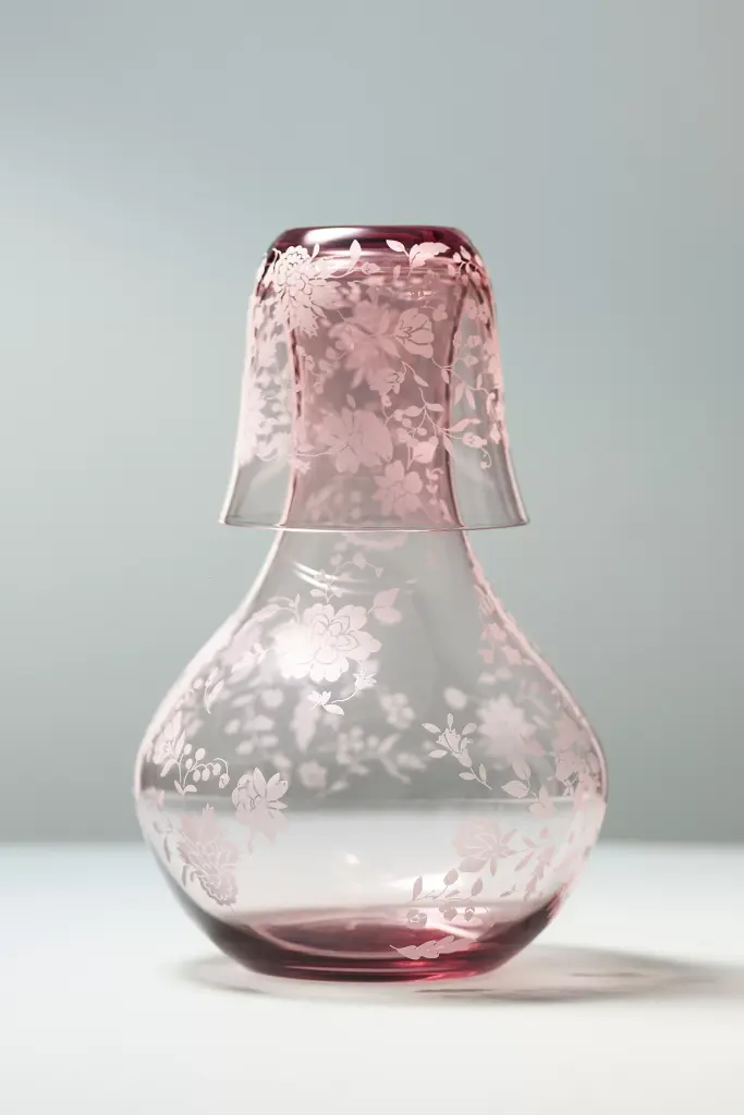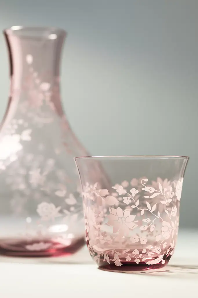 Get set for any soirée with the Mae Carafe & Wine Glass Set, featuring gleaming floral motifs.