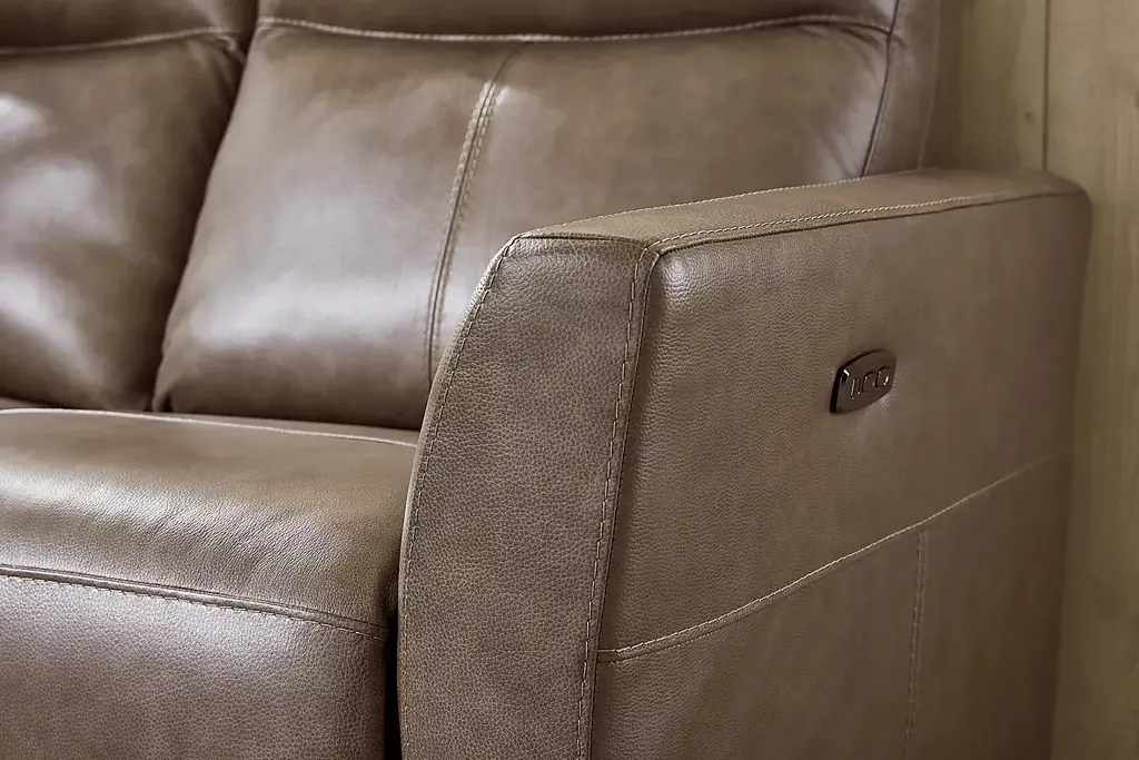 Harmony, comfort and modern elegance fill your room like a melodic symphony with the Maestro collection guiding every note and nuance with effortless flair. The sofa and loveseat in this contemporary set include dual power reclining features with head and footrests that can be raised or lowered to any desired position using the integrated control panels. Each panel has a USB port that makes charging to your mobile devices directly from the unit easy and convenient. Upholstered with top grain leather where the body touches in a brown mushroom color, each piece is tailored to perfection with stylish radius arms and top-stitched outer seams. Upholstery: Top grain leather where the body touches and polyurethane fabric sides and backs. Leather is a durable, low maintenance product, however, general regular maintenance is necessary. To keep your leather clean, vacuum it regularly, removing any dust, and clean it with water and a mild non-detergent soap.