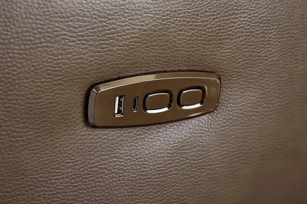 Harmony, comfort and modern elegance fill your room like a melodic symphony with the Maestro collection guiding every note and nuance with effortless flair. The sofa and loveseat in this contemporary set include dual power reclining features with head and footrests that can be raised or lowered to any desired position using the integrated control panels. Each panel has a USB port that makes charging to your mobile devices directly from the unit easy and convenient. Upholstered with top grain leather where the body touches in a brown mushroom color, each piece is tailored to perfection with stylish radius arms and top-stitched outer seams. Upholstery: Top grain leather where the body touches and polyurethane fabric sides and backs. Leather is a durable, low maintenance product, however, general regular maintenance is necessary. To keep your leather clean, vacuum it regularly, removing any dust, and clean it with water and a mild non-detergent soap.