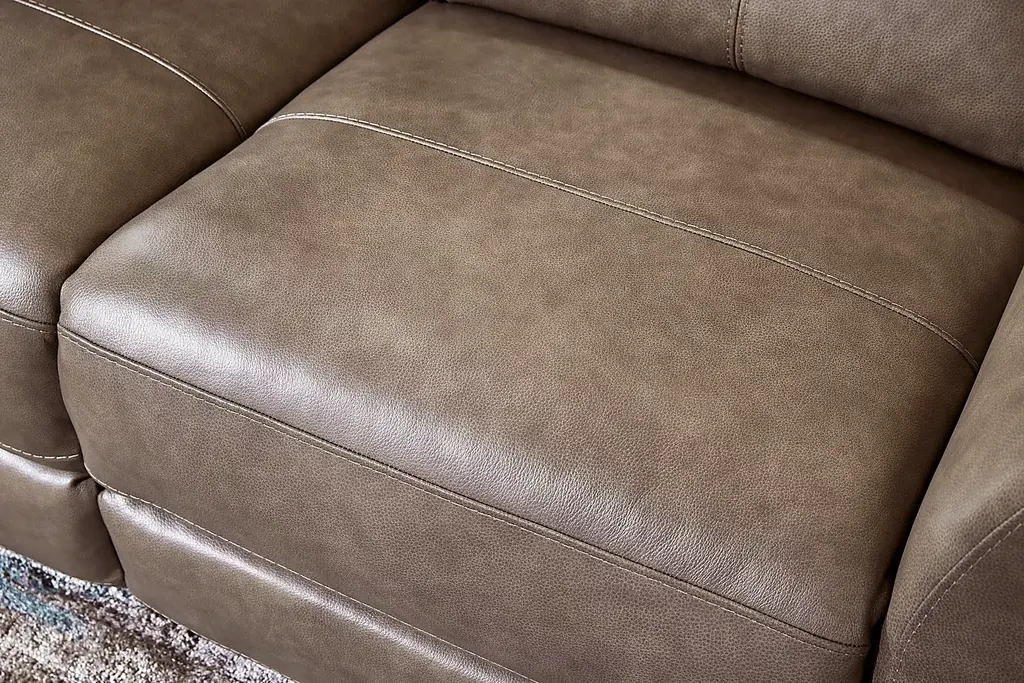 Harmony, comfort and modern elegance fill your room like a melodic symphony with the Maestro collection guiding every note and nuance with effortless flair. The sofa and loveseat in this contemporary set include dual power reclining features with head and footrests that can be raised or lowered to any desired position using the integrated control panels. Each panel has a USB port that makes charging to your mobile devices directly from the unit easy and convenient. Upholstered with top grain leather where the body touches in a brown mushroom color, each piece is tailored to perfection with stylish radius arms and top-stitched outer seams. Upholstery: Top grain leather where the body touches and polyurethane fabric sides and backs. Leather is a durable, low maintenance product, however, general regular maintenance is necessary. To keep your leather clean, vacuum it regularly, removing any dust, and clean it with water and a mild non-detergent soap. Lamps not as shown in room image.