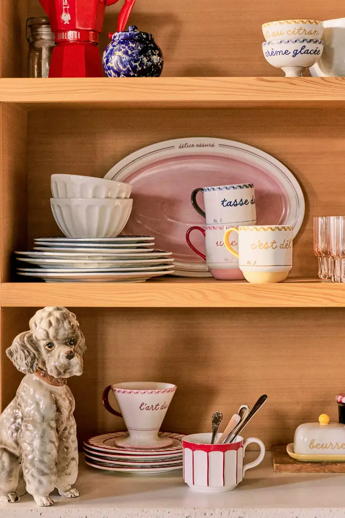 Vintage-inspired with a splash of primary color and playful script, this handpainted, decaled stoneware collection turns any table into a little corner caf. Made for everything from morning coffee to a full house of friends, it's proof you don't need to go far for a little *joie de vivre.*