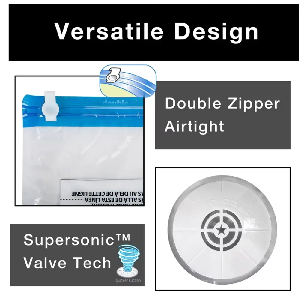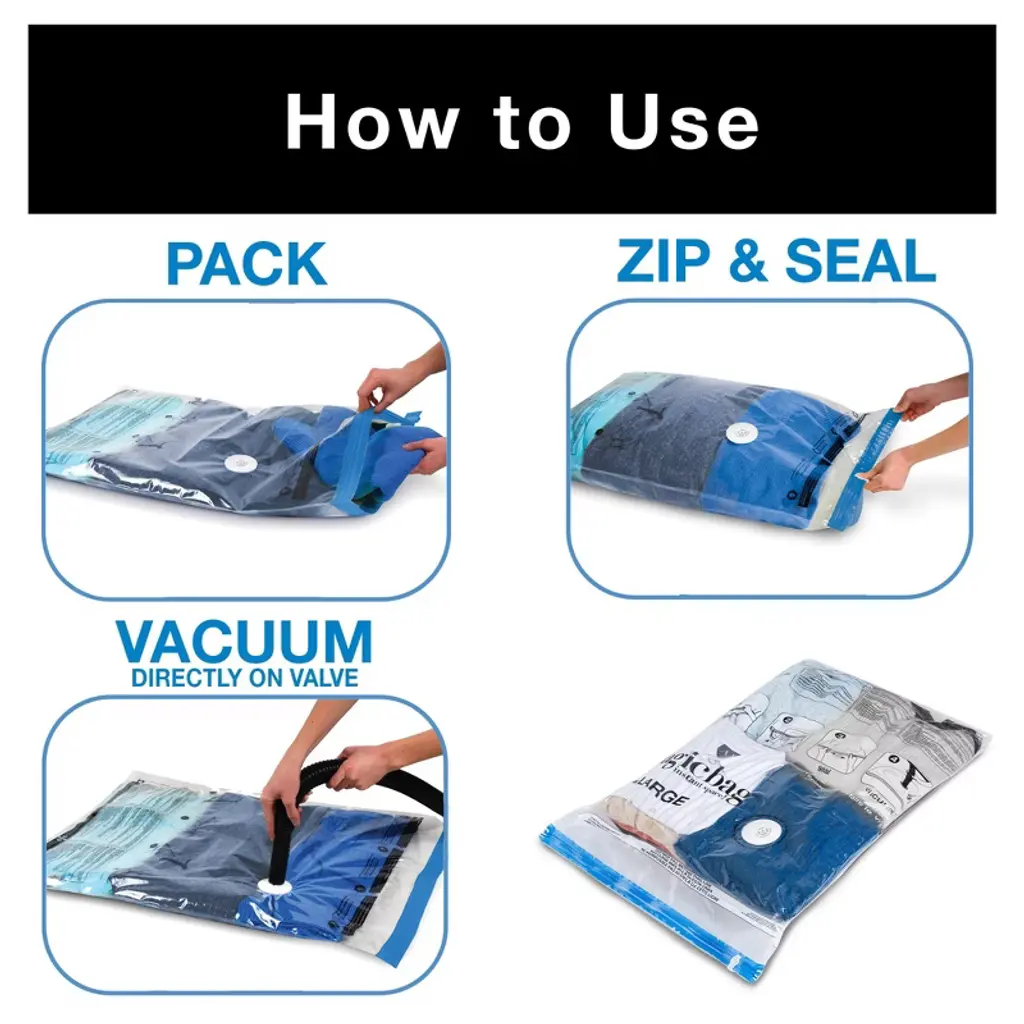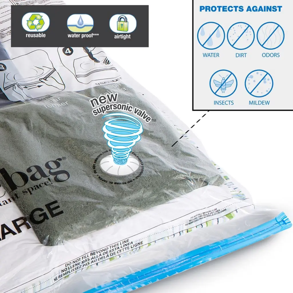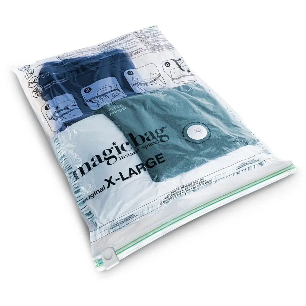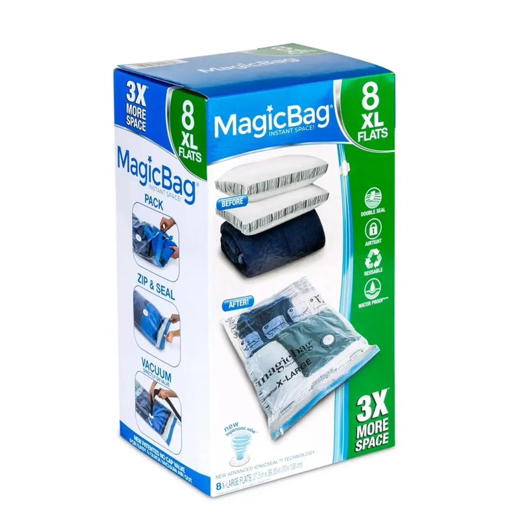 Create 3x more space in your closet, under your bed, in your garage, and just about anywhere by packing items inside this MagicBag, zip up bag with easy grip slider. These bags are vacuum sealed to remove all air and easy to store away. Your items will remain airtight and protected from season to season. This package includes 8 XL flat bags. Free Up More Space - MagicBag Space Saver bags create 3X more space in your closet, under your bed, or in storage bins by compressing your linens Create 3x more space in your closet, under your bed, in your garage, and just about anywhere by packing items inside this MagicBag, zip up bag with easy grip slider. These bags are vacuum sealed to remove all air and easy to store away. Your items will remain airtight and protected from season to season. This package includes 8 XL flat bags.