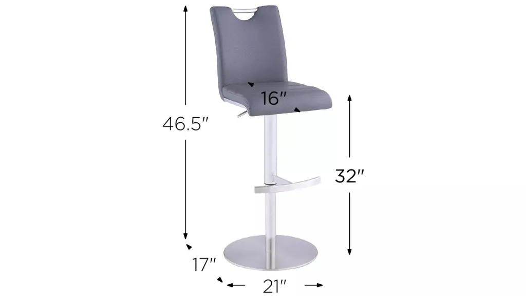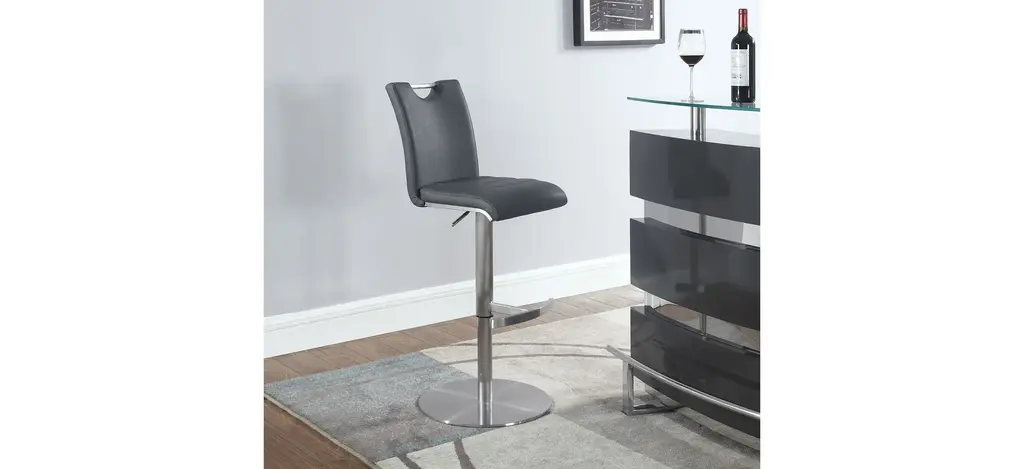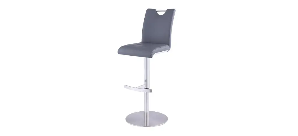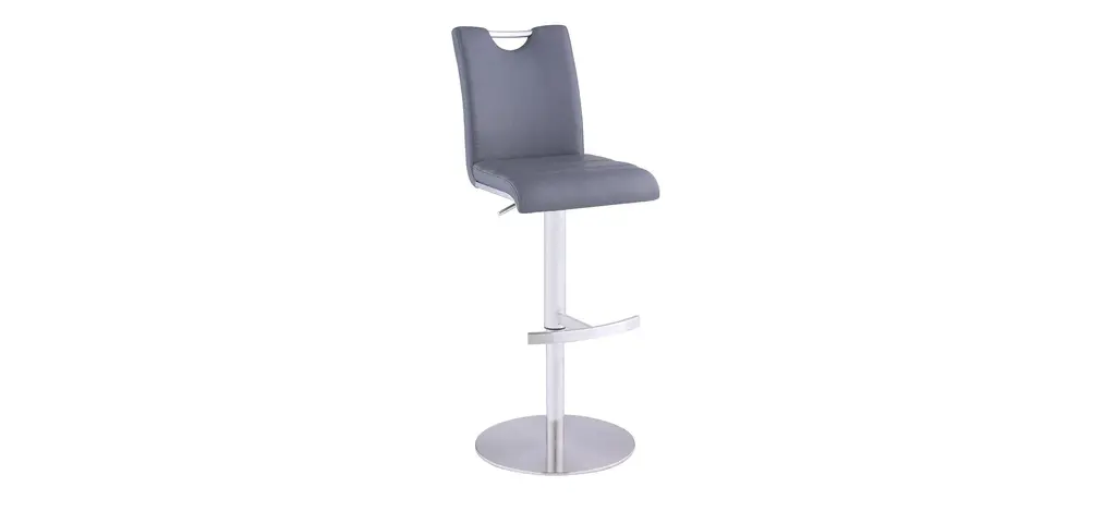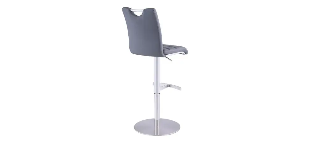 An handle back modern adjustable Magna stool with tufted faux leather upholstery and waterfall edge for comfortable seating . The brushed stainless steel pedestal provides adjustable height, 360 swivel and footrest.