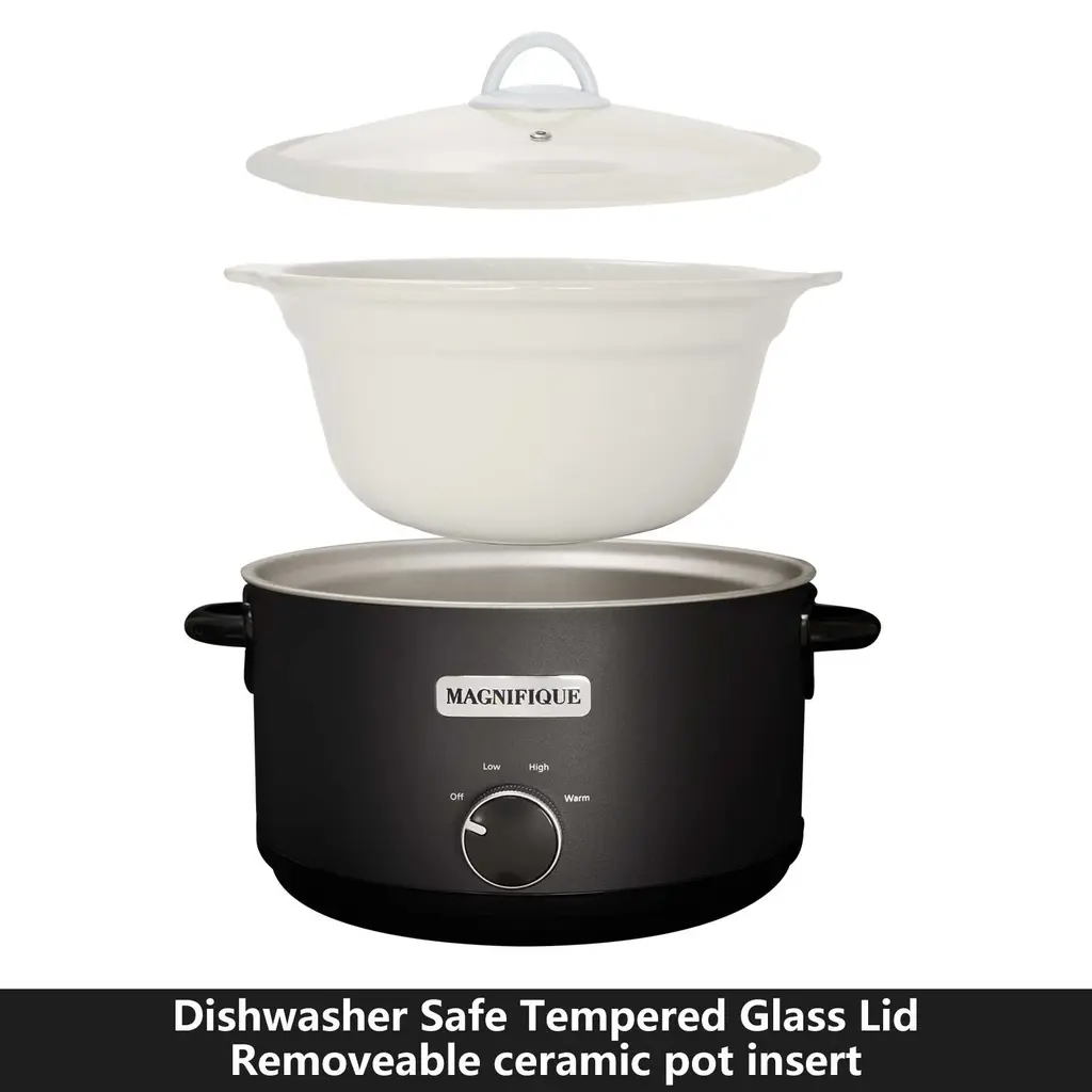3 COOKING SETTINGS - Adjustable Low / High / Keep Warm settings for versatile cooking options. Customize design allows you to adjust the cooking temp according to your cooking habits and preferences. The slow cooker has a heat preservation function, even if you are not in the kitchen, you can make hot meals and keep warm. VERSATILE SERVING BOWLS - Removable ceramic pot, Perfect for a variety of dishes—salads, pho, ramen, and noodles—These serving bowls are suited for any number of uses, such as prepping, mixing, stirring, and baking like a pro. LARGE CAPACITY - The MAGNIFIQUE Slow Cooker features an round shape, providing ample space to cook large cuts of meat or accommodate whole chickens for family dinners. 5 quart oval manual slow cooker serves 9+ people. SAFE TO USE - Thick stainless steel with good heat insulation brings non melt and cool touch handles and shells to protect your hands from burns and assure you safe transport. The tempered glass lid can bear high temperature and long time use. DISHWASHER SAFE - Easy cleaning mirror stainless steel made and dishwasher safe removable ceramic pot and glass lid are convenient to be cleaned in dishwasher with warm soapy water after use. The stainless steel heating base can be wiped clean with a damp cloth to maintain its original appearance. 100% REFUND/REPLACEMENT - MAGNIFIQUE provides a one-year limited warranty. If you encounter product malfunctions during this period, please contact us.