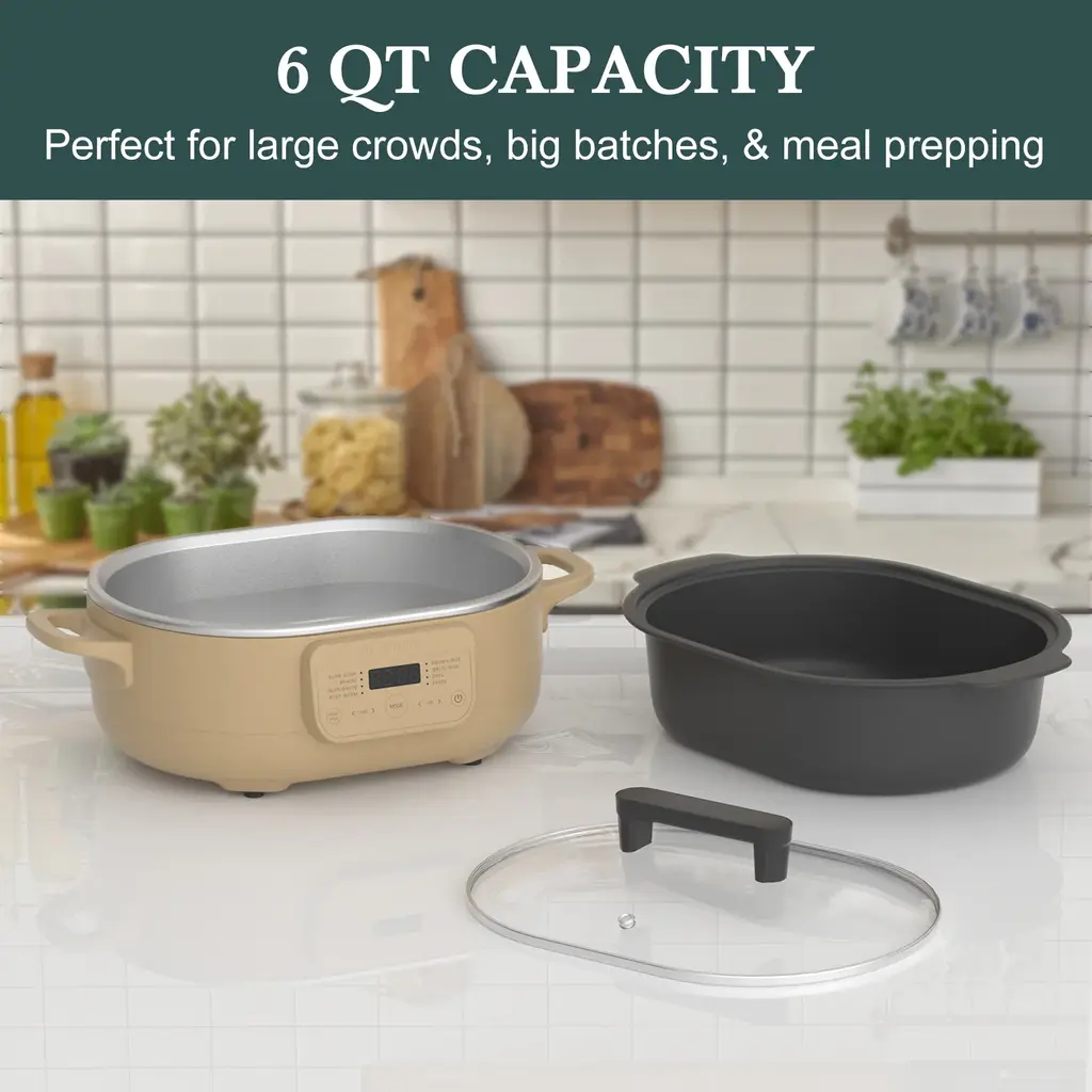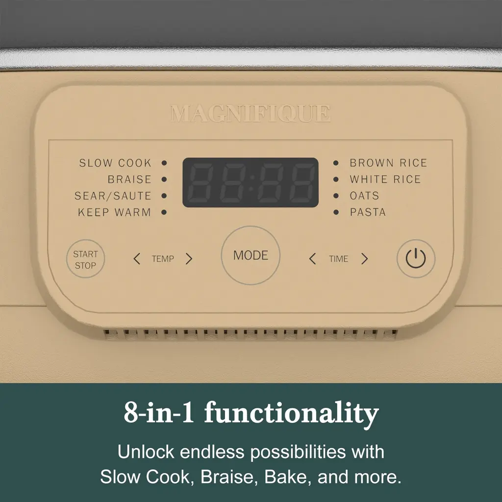 8-in-1 Versatility: Replace multiple kitchen appliances with this 6-quart multi-cooker, which functions as a slow cooker, rice cooker, Dutch oven, and more—perfect for cooking oats, rice, braising, searing, and beyond. One-Touch Presets: Simplify meal prep with pre-programmed settings for Slow Cook, Braise, Sear/Sauté, Keep Warm, Brown Rice, White Rice, Oats, and Pasta Oven-Safe Removable Crock: Designed to withstand temperatures up to 500°F, the dishwasher-safe ceramic crock allows you to finish dishes in the oven for a crispy, restaurant-quality finish. Omnidirectional Heating Technology: Enjoy even cooking with bottom, side, and topside heat sources, plus steam circulation—ideal for slow cooking, braising, rice, and more. Large 6-Quart Capacity: Perfect for family meals, entertaining, or meal prepping, this spacious cooker handles everything from hearty stews to party-sized portions with ease.