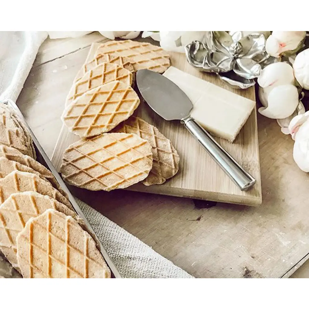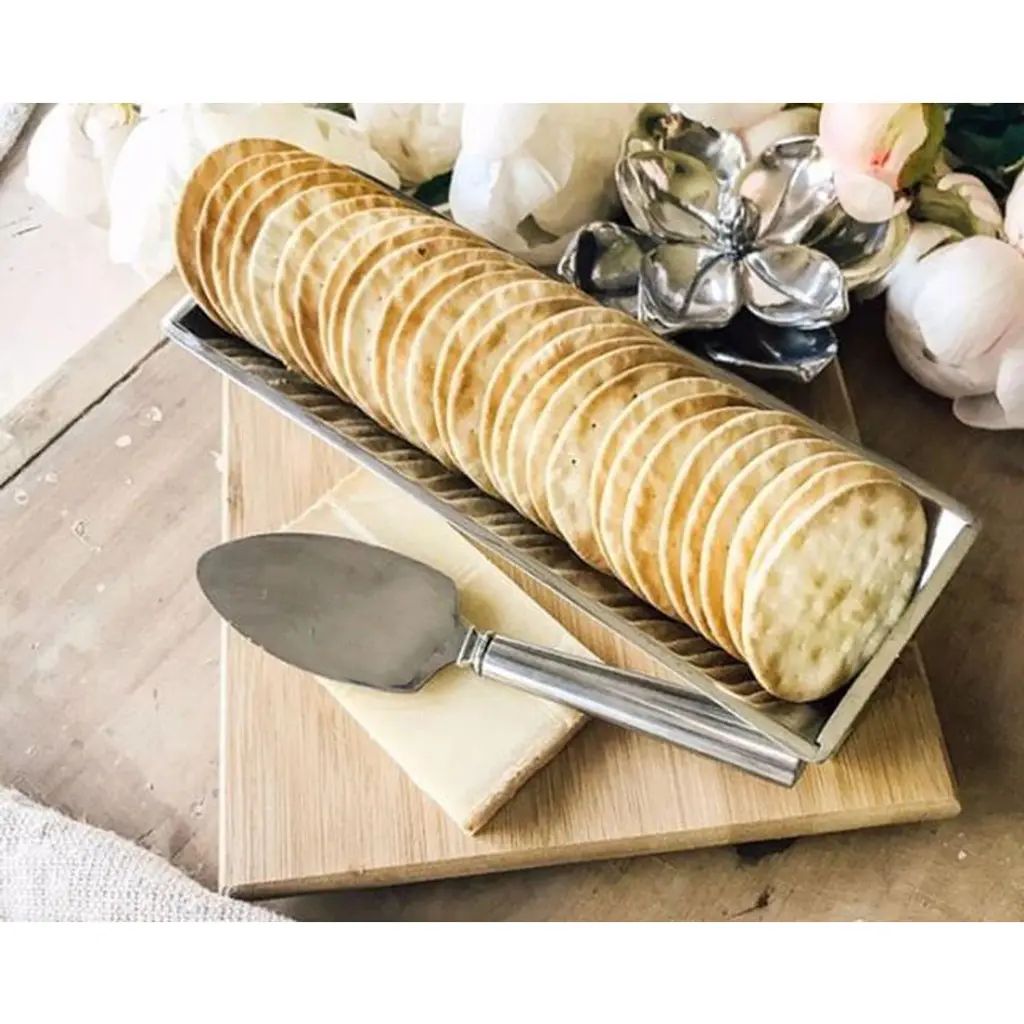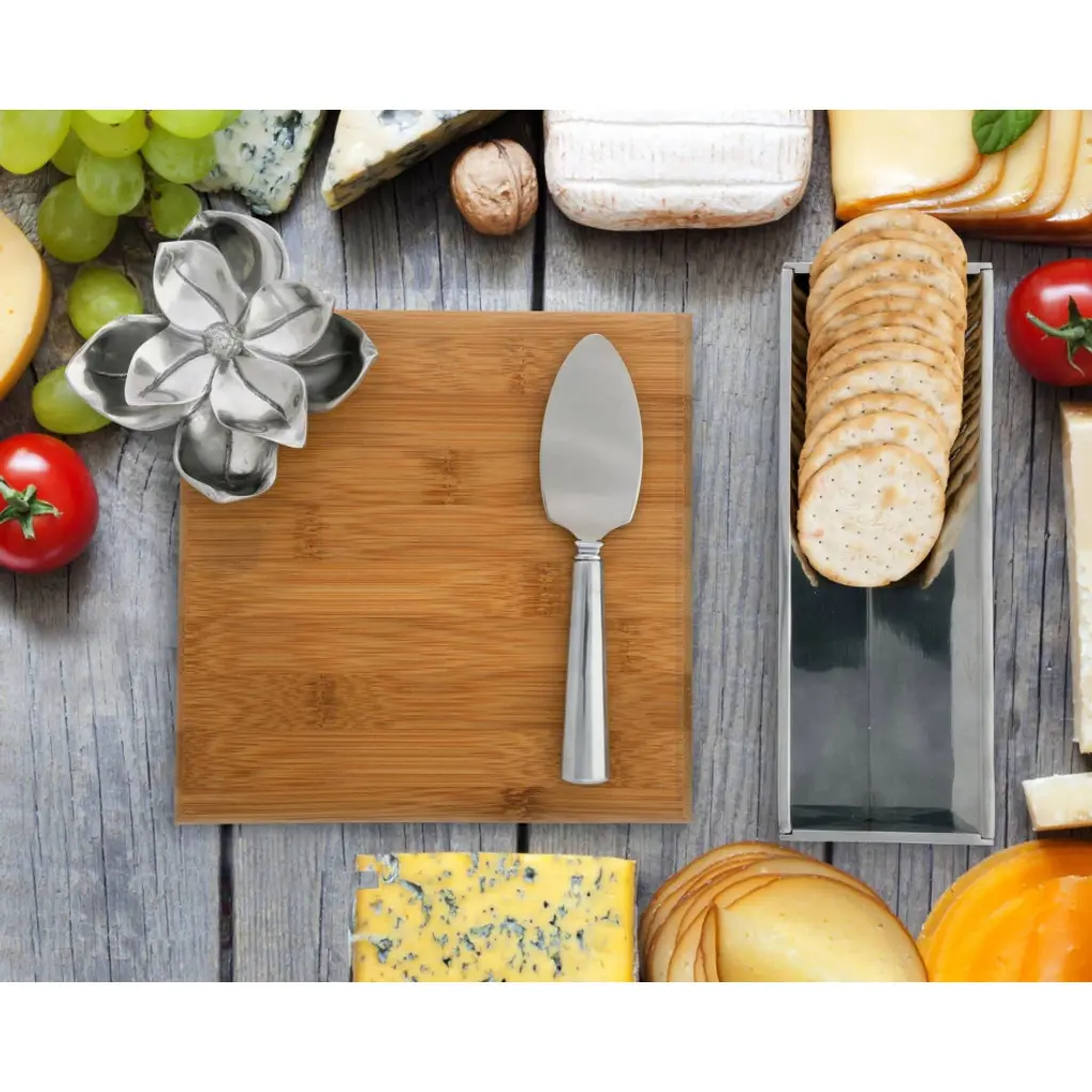 Embellish beautiful bamboo with the handmade, aluminum accents in Arthur Court's Magnolia Cheese Set. A magnificent, layered flower graces the upper-left corner of this board as its petals fan out in all directions. The lustrous finish of the cheese knife and cracker stand contrast nicely with the bamboo's soft color.