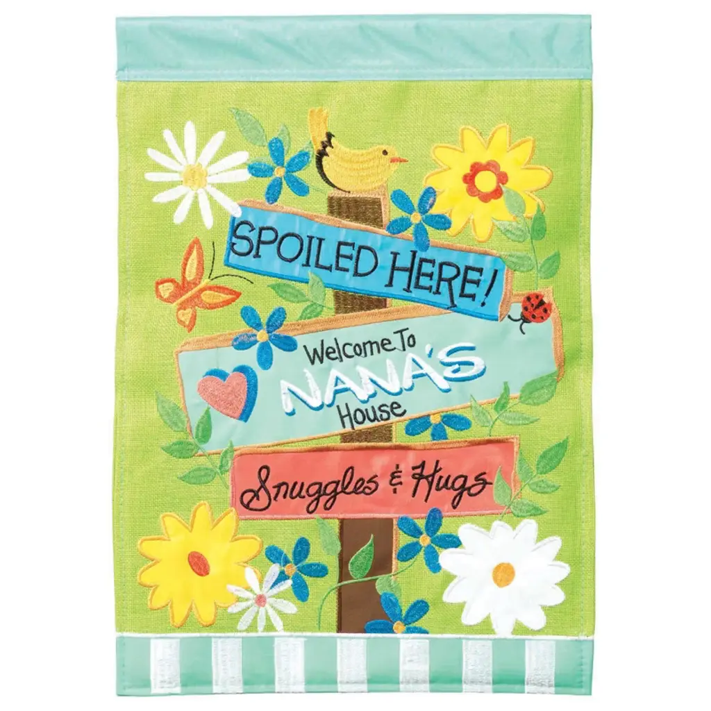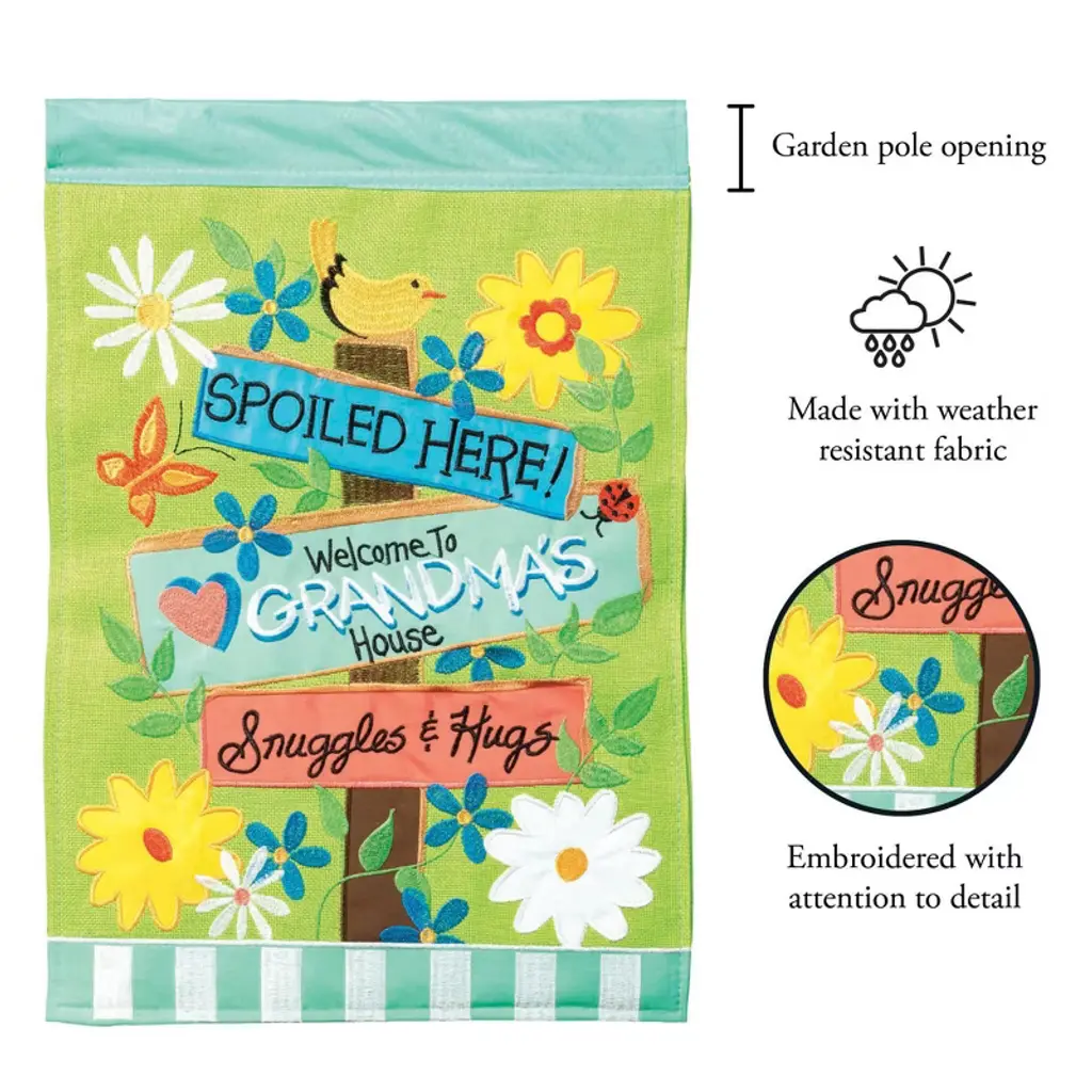 This garden flag by Magnolia Garden is designed with a combination of fabric appliques and exquisitely detailed embroidery on both the front and back; Flagpole sold separately. Features the words, "Spoiled Here! Welcome to Grandma's House, Snuggles and Hugs" in trendy font written on three separate boards on a sign post, surrounded by bright spring flowers with butterflies and birds. Made of quality polyester double thickness material; These flags are heavier than most others on the market and will hold up for longer, They will retain its color and beauty for years if displayed in shade or semi-shade, and is rainproof; Measures approximately 13 inches wide and 18 inches tall. Perfect for displaying in a garden, on its own or as part of a garden display year-round; Fits most standard garden poles, sold separately; Care Instructions: Handwash in cold water, Air dry with no heat. Contained in protective packaging; Ready for easy gifting for a housewarming, birthday, or any special occasion