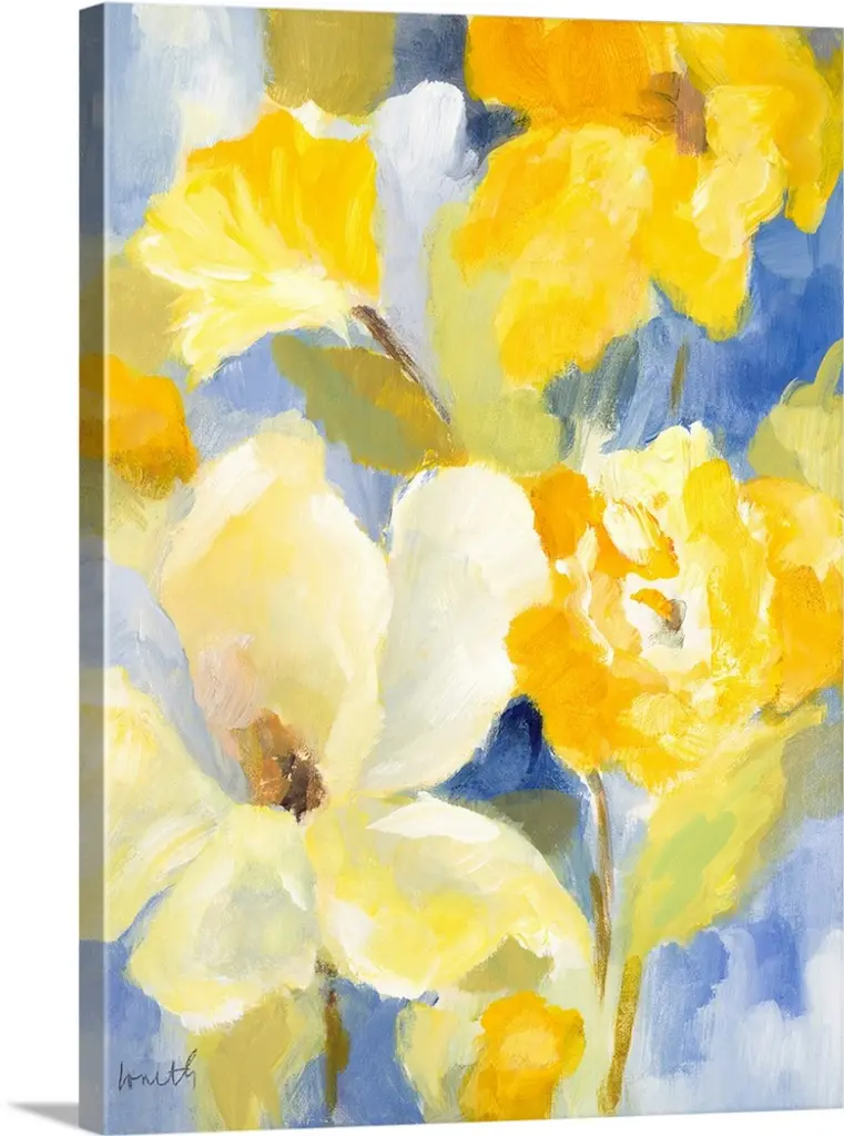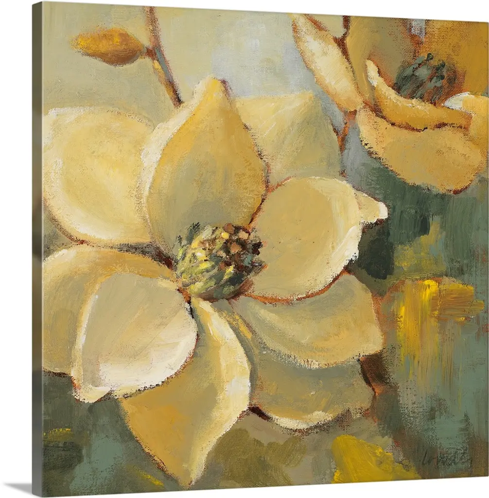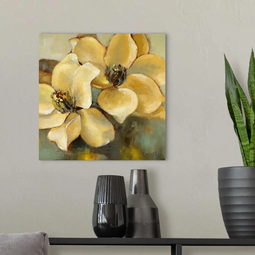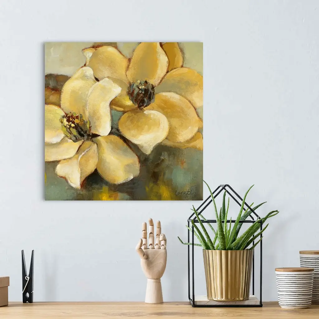 Large wall picture of two magnolia flowers in a mixture of warm and neutral but overall relaxing tones.