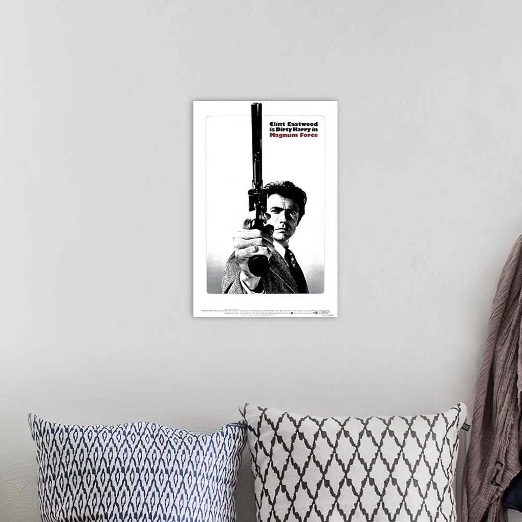 Poster for the movie "Magnum Force" showing Clint Eastwood and the gun he is holding straight up into the air very largely in the foreground.