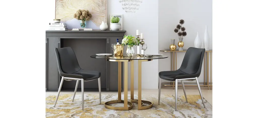The Magnus Dining Chair: set of 2 provides brushed stainless steel legs that are complete with protective plastic feet to keep your floors scratch-free.