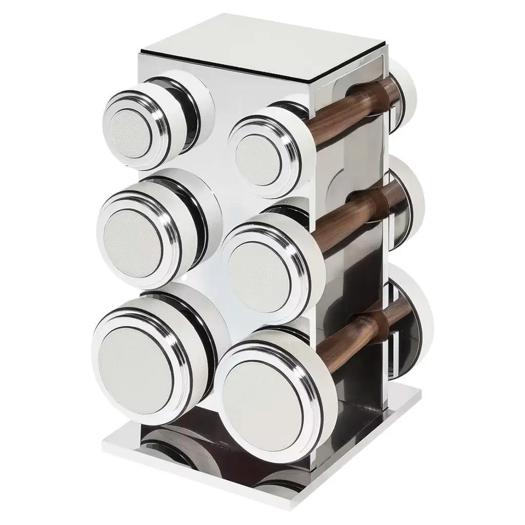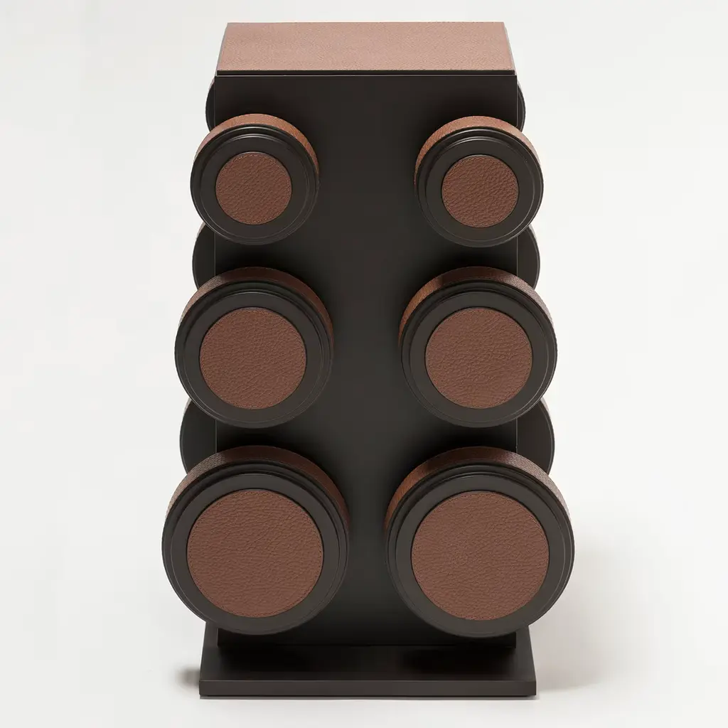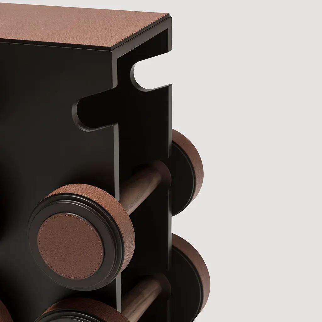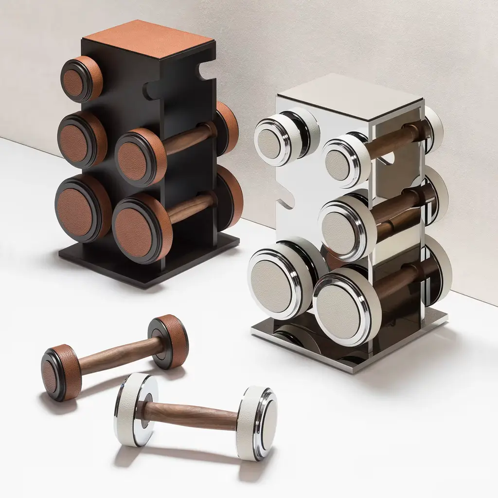 The Magnus gym weights set paves the way for a new elegant solution to keep fit. This set can include pairs of 1kg, 3kg, and 5 kg weights or pairs of 2kg, 4kg, and 6 kg weights, and is available in three different metal finishes: polished chrome brushed bronze and brushed brass. Featuring walnut wood grips and fine leather inserts, this set is easily customizable thanks to the extremely wide color palette available, which includes more than 300 nuances and textures.