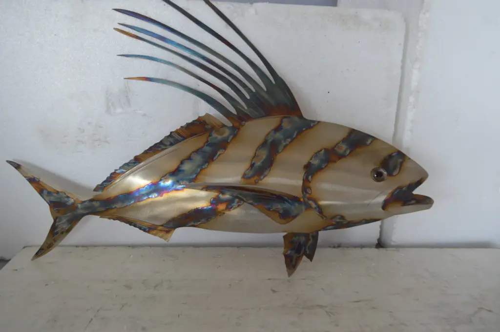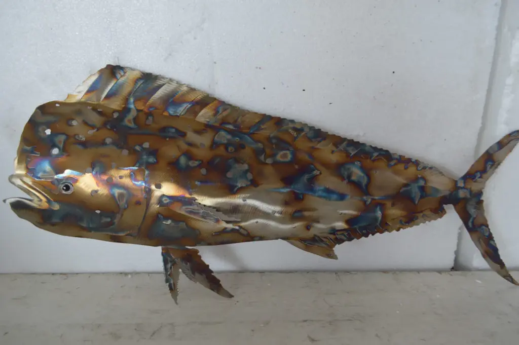 This Mahi-Mahi fish is crafted using laser cut steel and can be mounted on any wall desiring of a nautical addition. The immense detail is present from the iridescent color to extension of its profile, making it both realistic looking and unique in design. This work of art would pair well with any of the other nautical mounted wall art. Size: 26"L x 2"W x 14"H. Weight is: 2Lb
