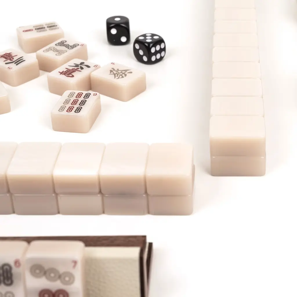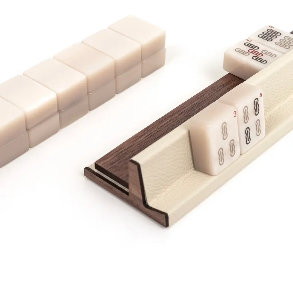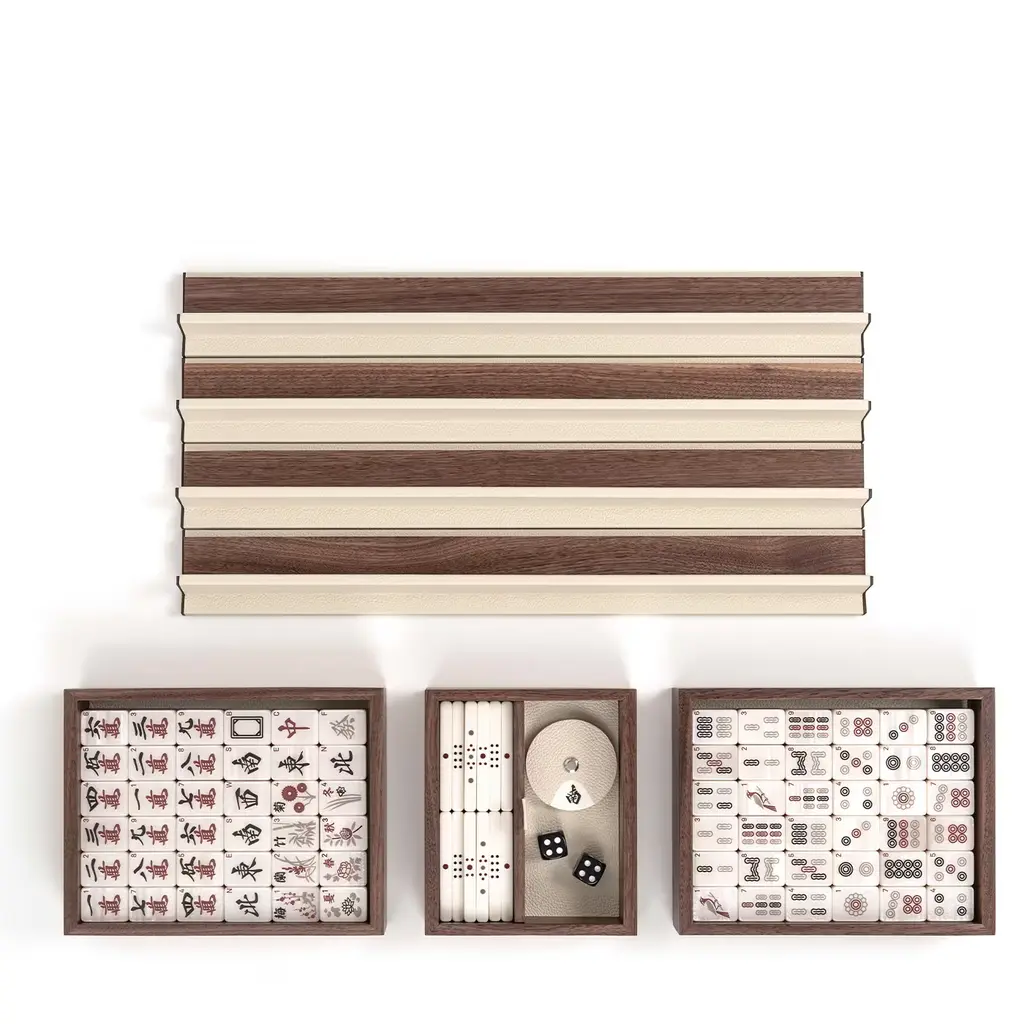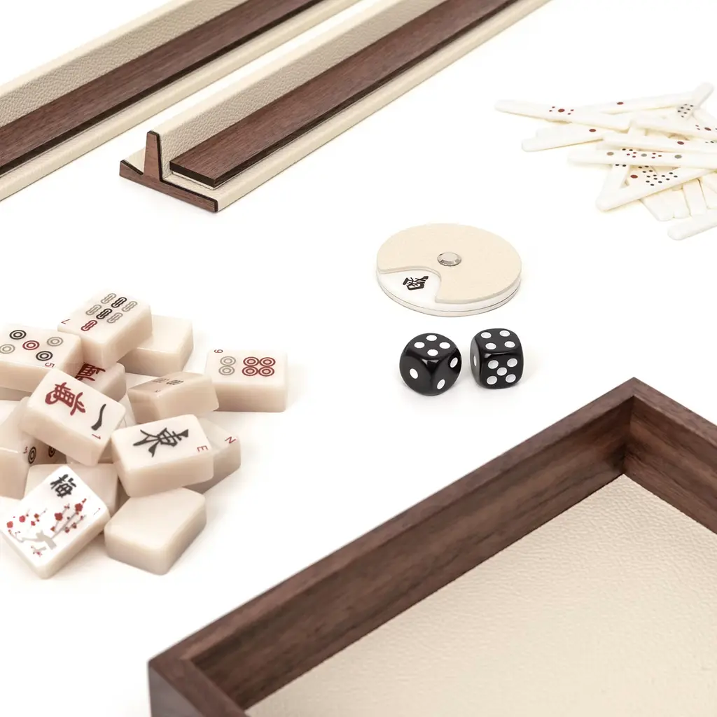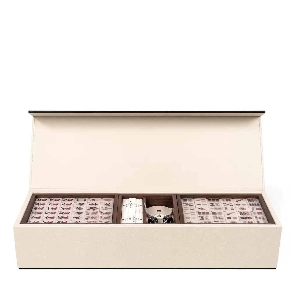A contemporary take on a timeless classic, the Mahjong Board Game by Pinetti is a precious restyling of one of the most popular games in the world. Handcrafted of walnut wood, it features a magnet-equipped lid, and a first-rate cream-colored Cairo leather upholstery. The game set comprises 144 pearled tiles, 88 sticks, four racks and one swivel indicator. Please consult the Concierge for further details.