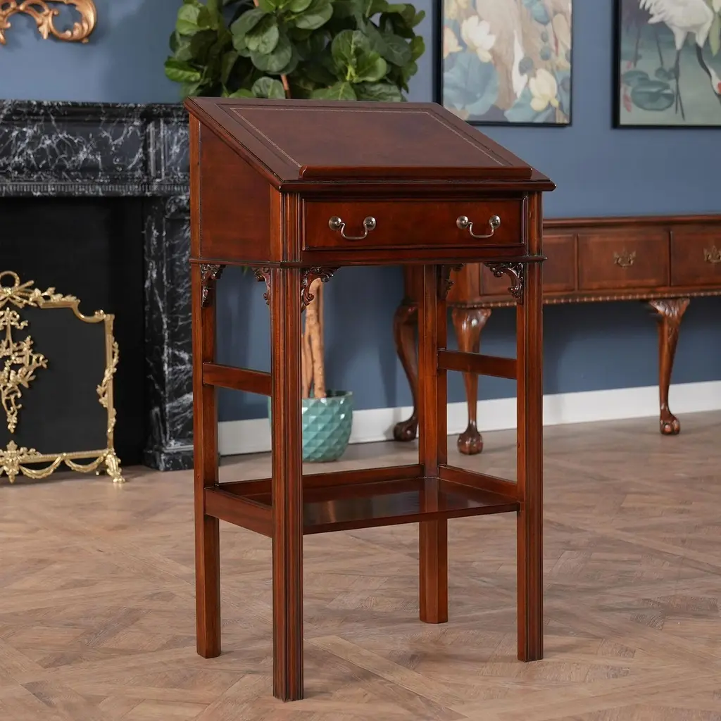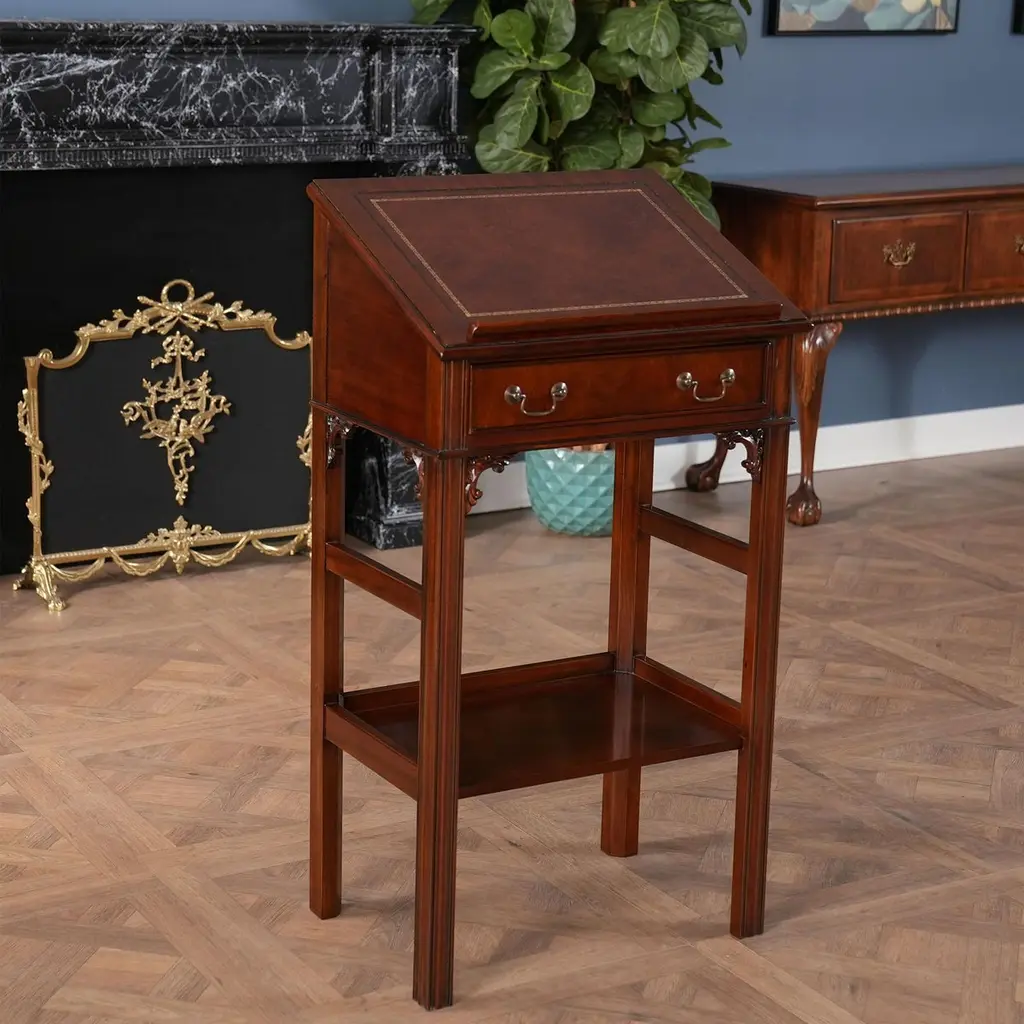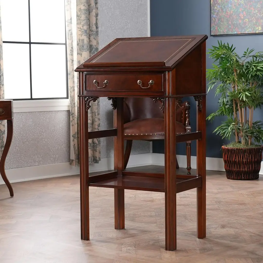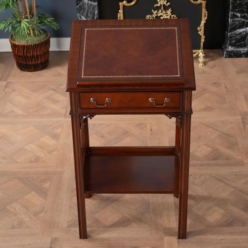 This beautiful Mahogany and Leather Lectern from Niagara Furniture is made of the finest solid mahogany and mahogany veneers. Built with clean, straight lines, the desk has a slant top lid with a genuine full grain leather surface incised with gold tooling. The spacious interior is accompanied by a drawer below for extra storage space. The desk rests firmly on great quality solid mahogany fluted legs with pierced brackets. The front and back legs of the Mahogany and Leather Lectern are connected by a shelf for additional strength and support. A great item for either the home or workplace but also used in restaurants and speaking halls.Measures 22″ w x 15″ d x 42″ h