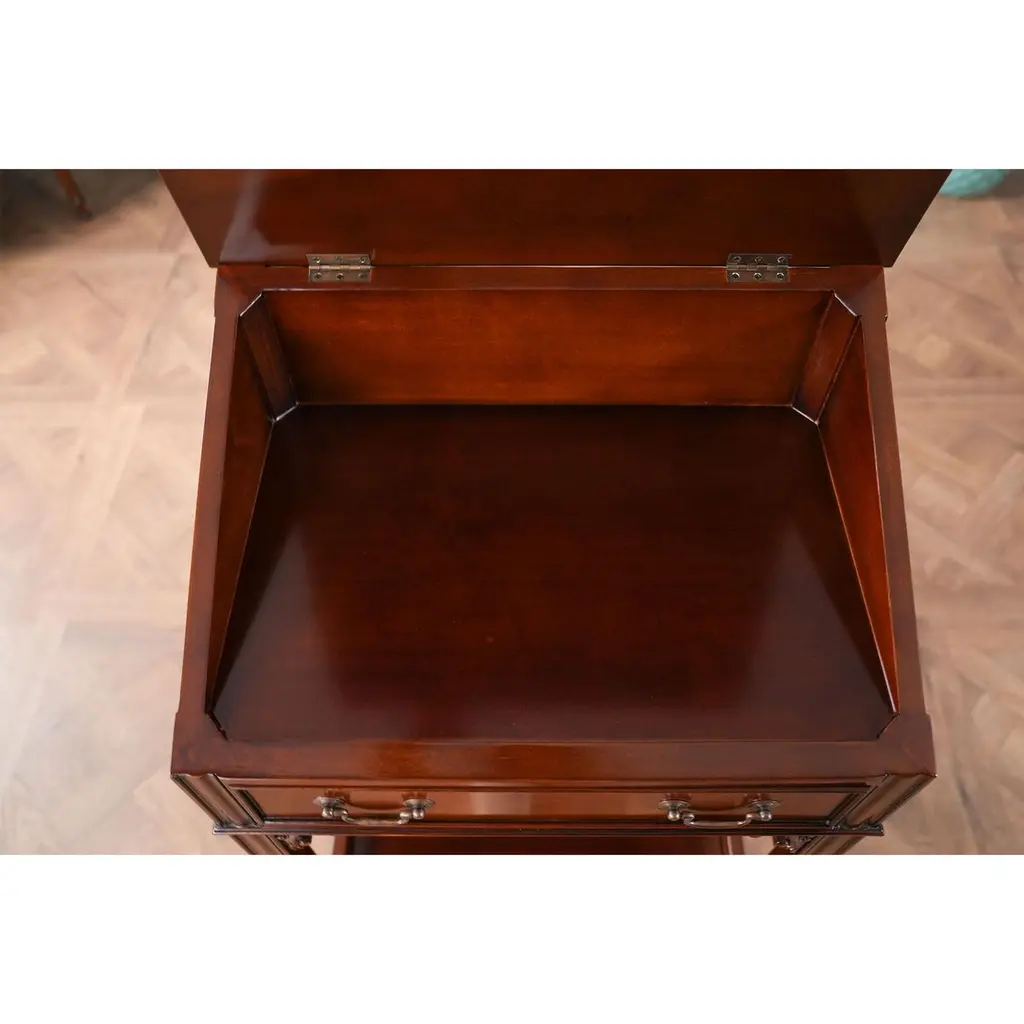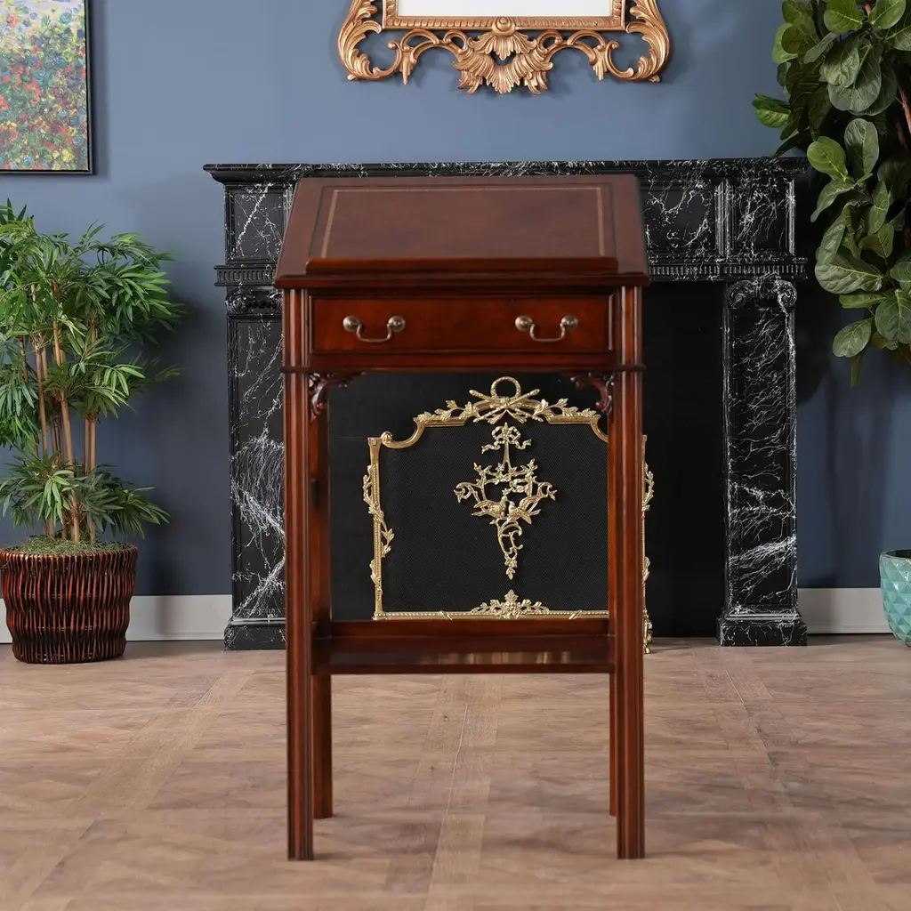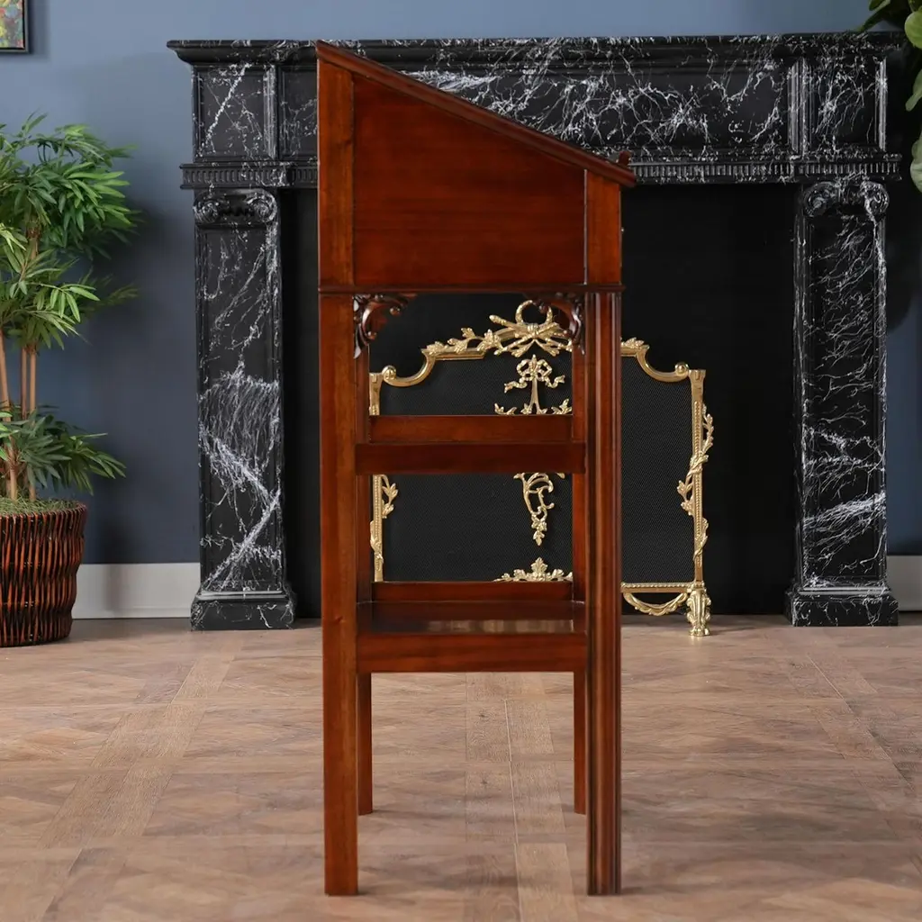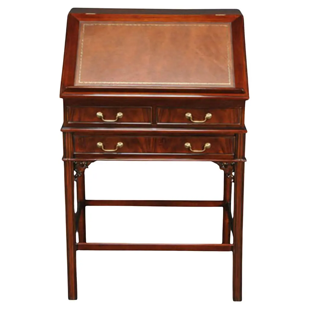 This beautiful Mahogany and Leather Lectern from Niagara Furniture is made of the finest solid mahogany and mahogany veneers. Built with clean, straight lines, the desk has a slant top lid with a genuine full grain leather surface incised with gold tooling. The spacious interior is accompanied by a drawer below for extra storage space. The desk rests firmly on great quality solid mahogany fluted legs with pierced brackets. The front and back legs of the Mahogany and Leather Lectern are connected by a shelf for additional strength and support. A great item for either the home or workplace but also used in restaurants and speaking halls.Measures 22″ w x 15″ d x 42″ h