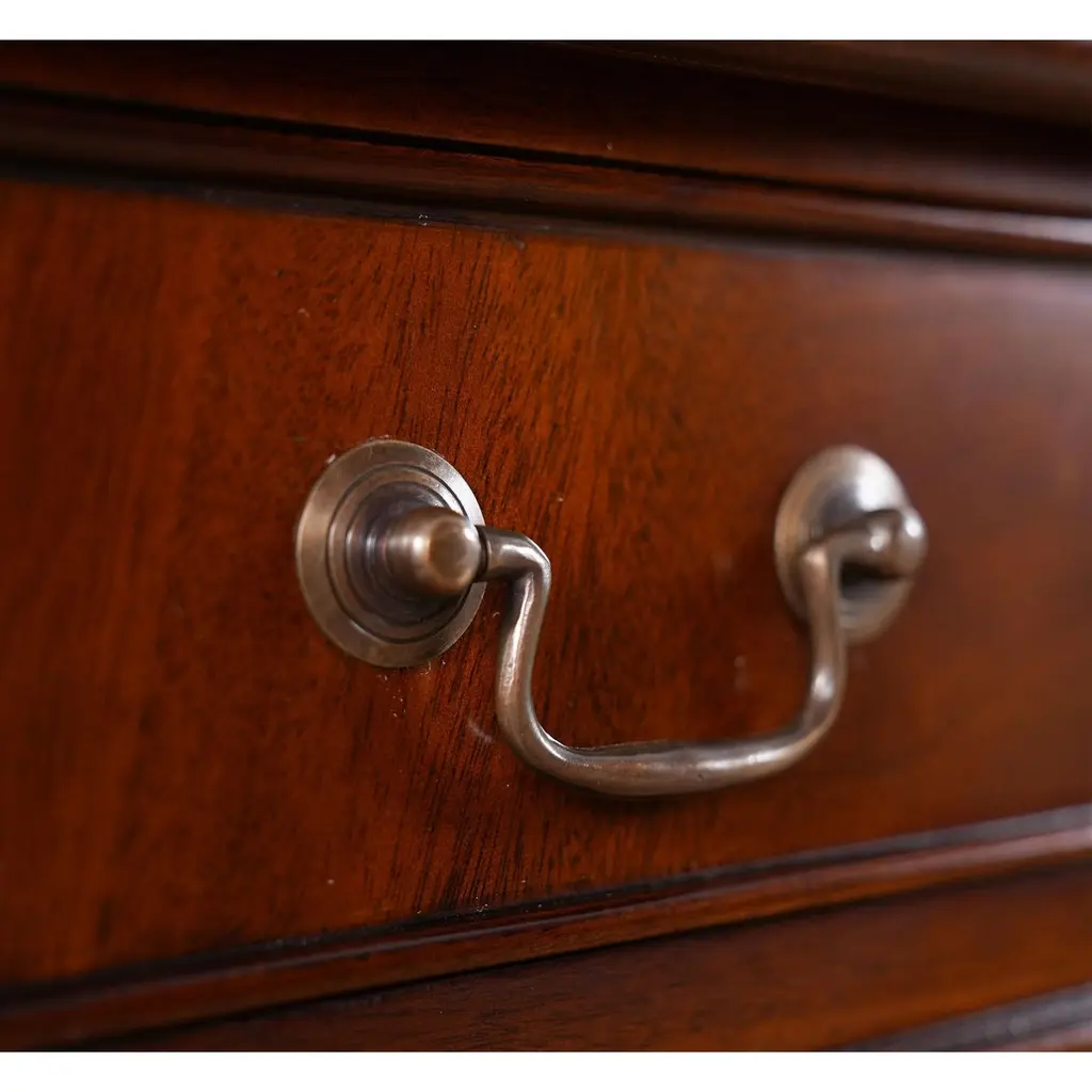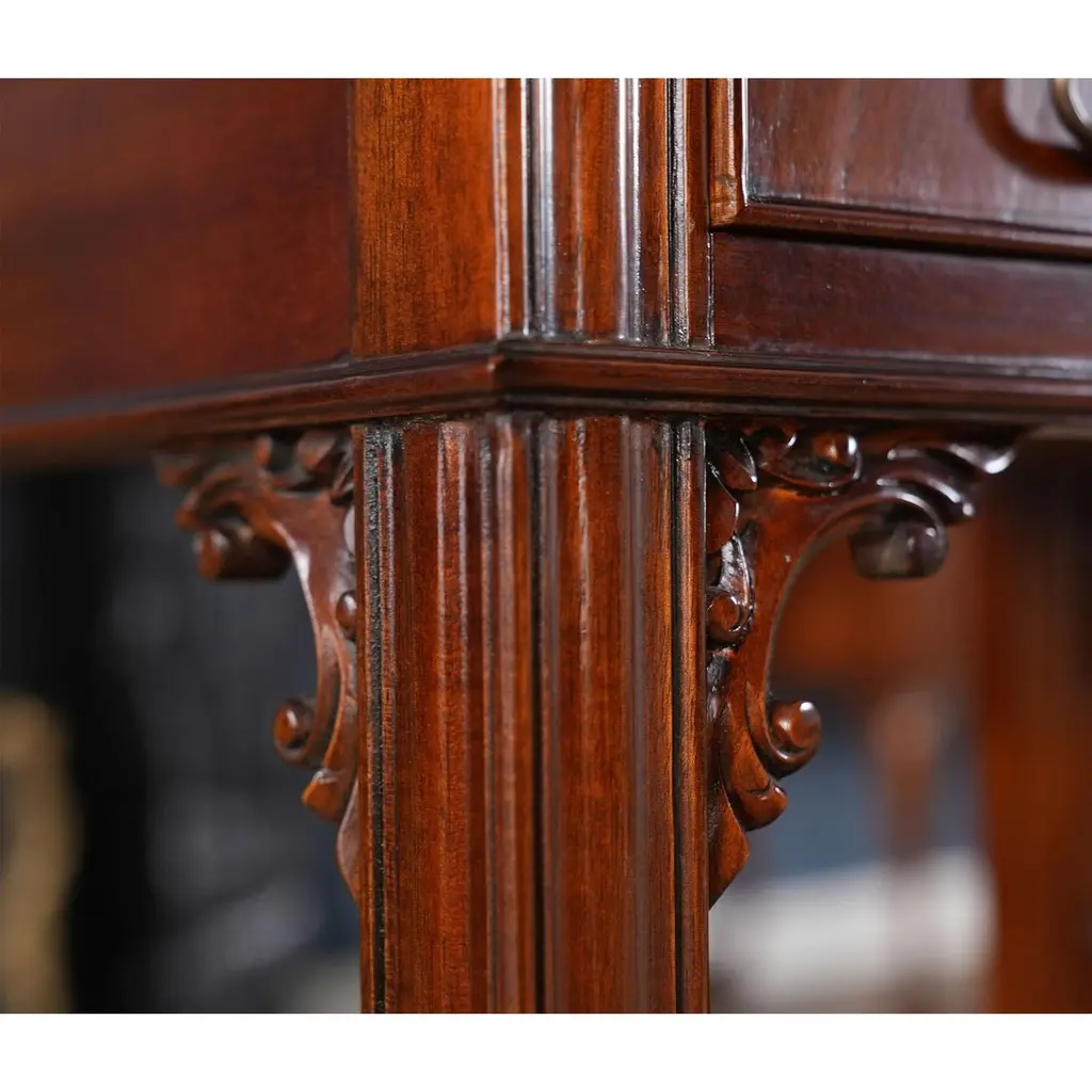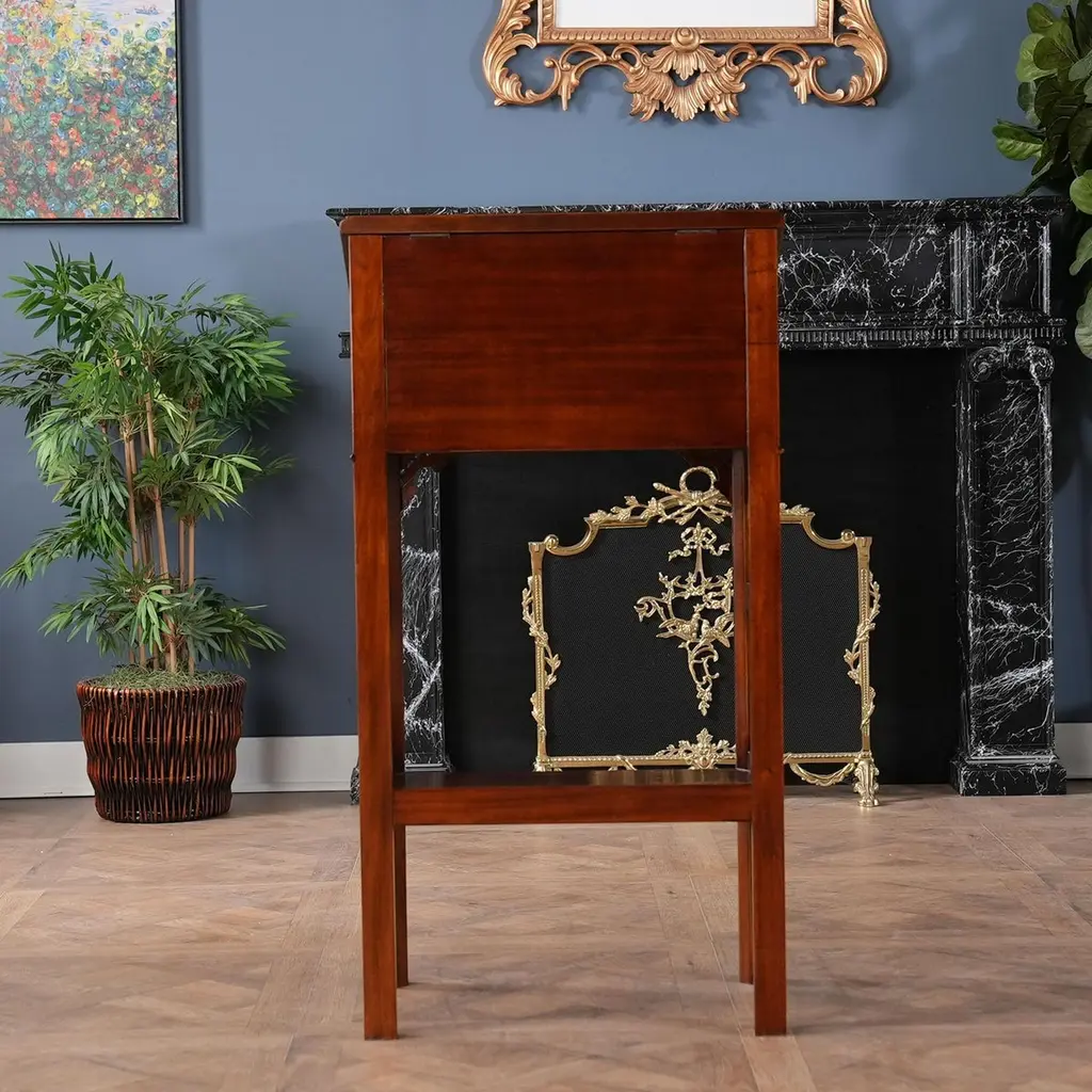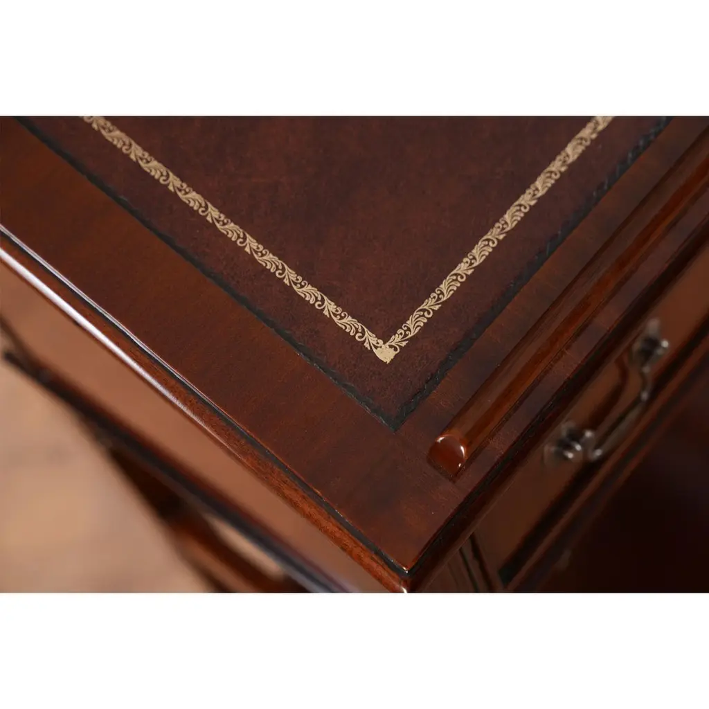 This beautiful Mahogany and Leather Lectern from Niagara Furniture is made of the finest solid mahogany and mahogany veneers. Built with clean, straight lines, the desk has a slant top lid with a genuine full grain leather surface incised with gold tooling. The spacious interior is accompanied by a drawer below for extra storage space. The desk rests firmly on great quality solid mahogany fluted legs with pierced brackets. The front and back legs of the Mahogany and Leather Lectern are connected by a shelf for additional strength and support. A great item for either the home or workplace but also used in restaurants and speaking halls.Measures 22″ w x 15″ d x 42″ h