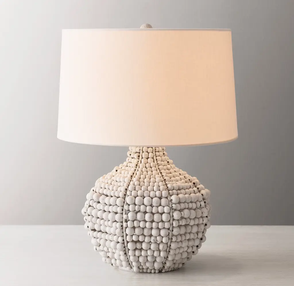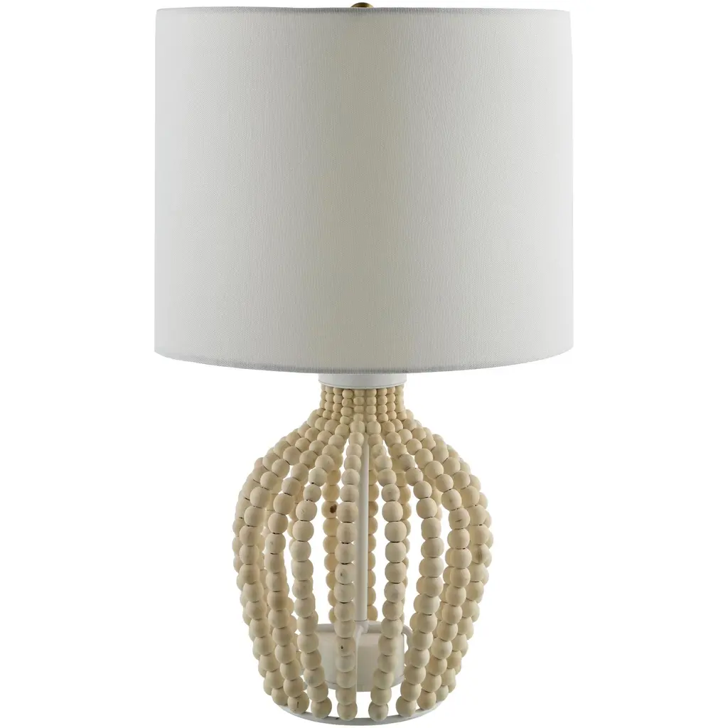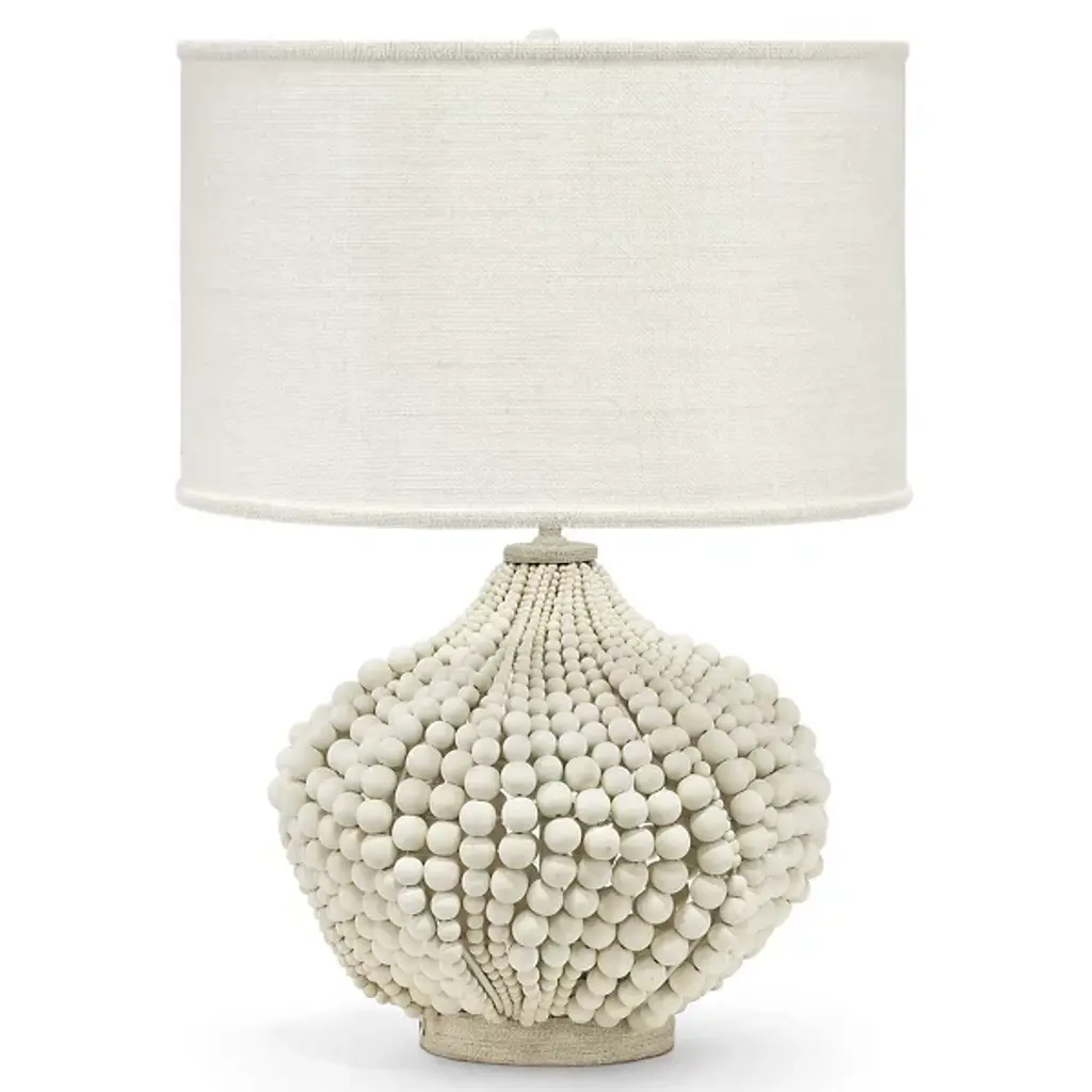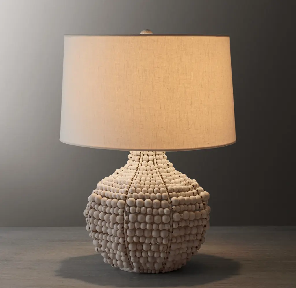 With its rounded wire frame draped in hand-strung wooden beads of varying sizes, our table lamp lends a room an organic presence. A textural cotton-linen drum shade provides an elegant finishing touch.