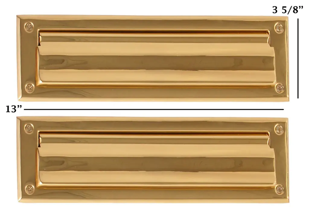 Mail Slot is made from solid brass material and available in many finishes. Mail Slot has flaps on both sides of the door. The exterior is a spring-loaded flap and the interior is a gravity flap. Installation hardware is included making it quick and easy. Enhances the overall appearance of any Entryway. Hole size required is 2-3/4" x 11-5/8" for the 3-5/8" x 13" Mail Slots. Center to Center dimensions are 2 5/8" Horizontal and 11 15/16" Vertical.