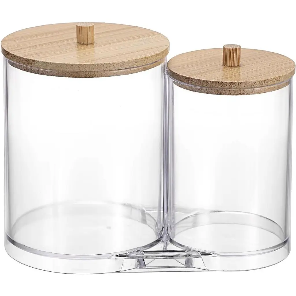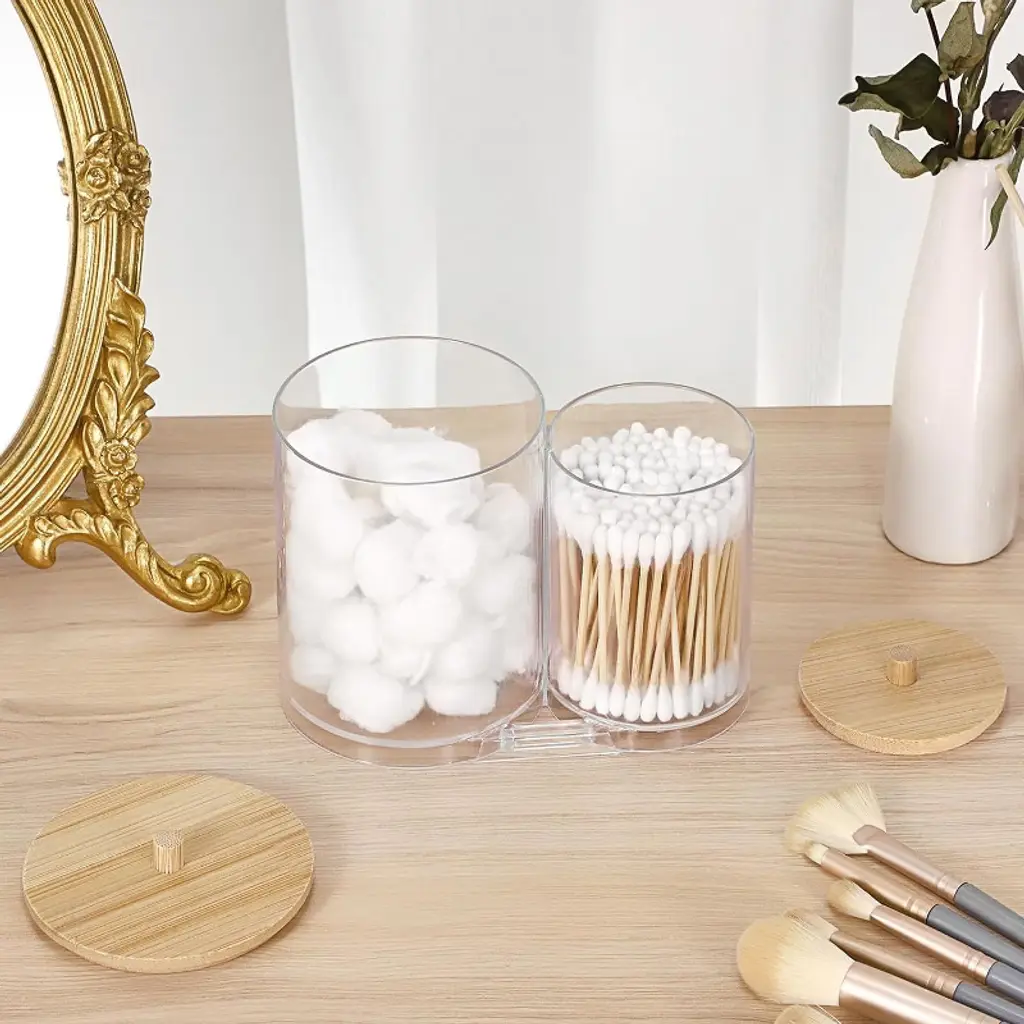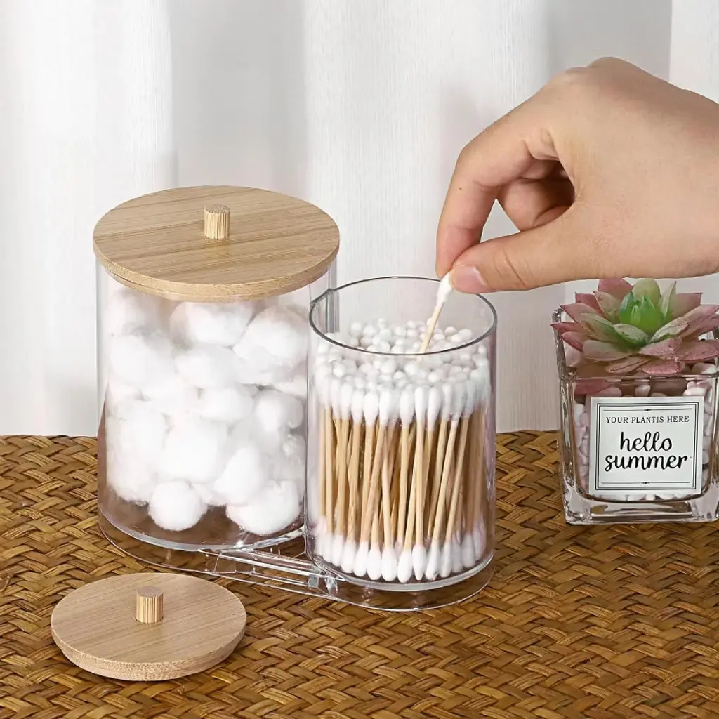 Maison 2 In 1 Cotton Swab And Qtip Acrylic Holder our acrylic bathroom canister provides two sufficient spaces for you to organize. And the compact 2-in -1 bathroom canister saves space, fits perfectly on small counters or shelves, making it a practical solution for any space where organization matters.