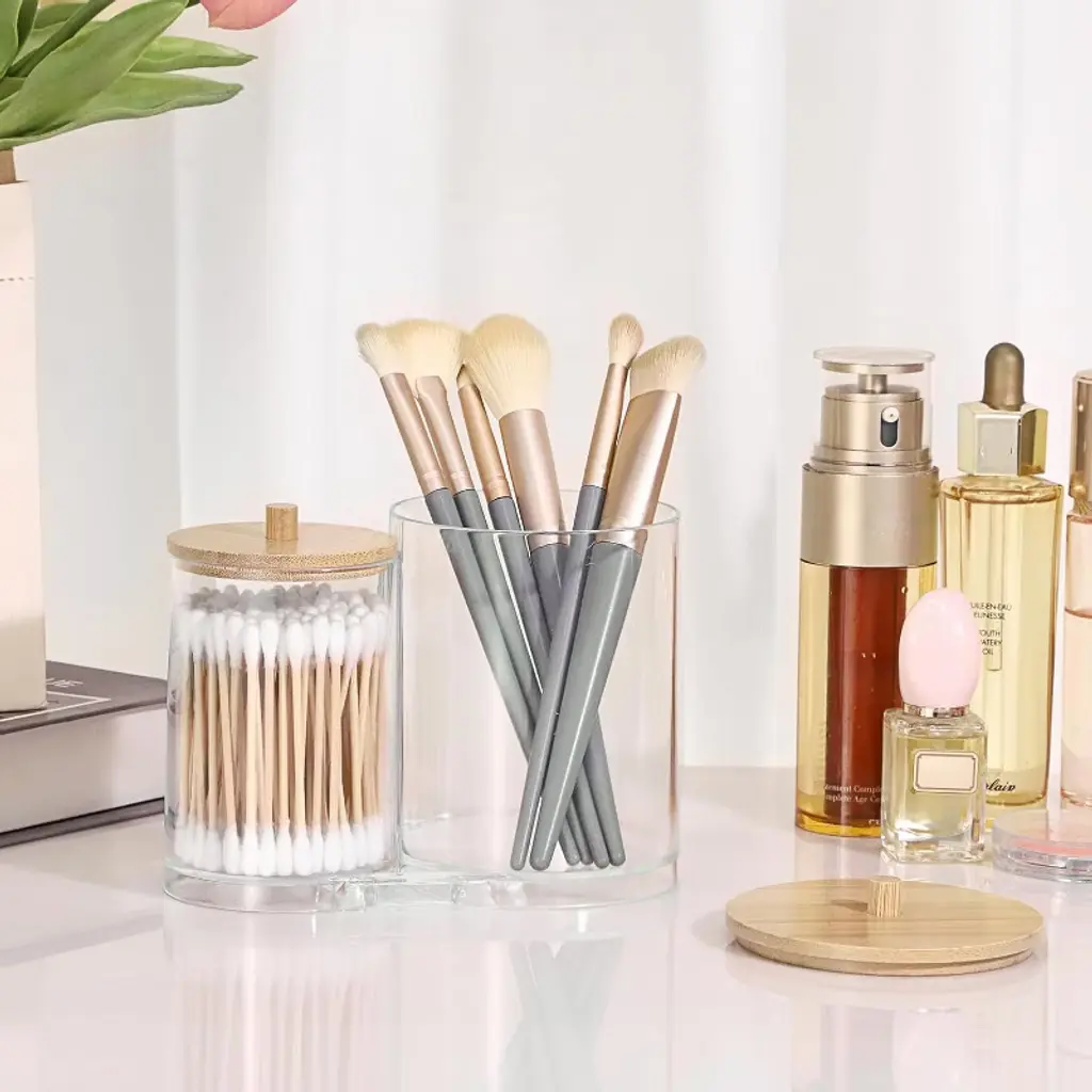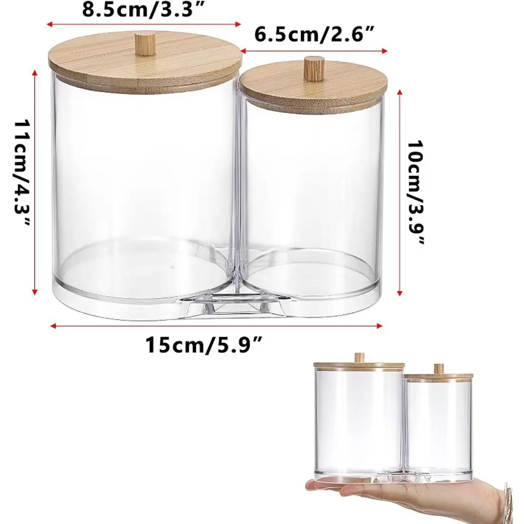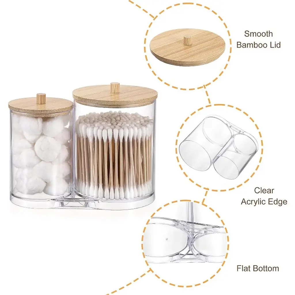 Maison 2 In 1 Cotton Swab And Qtip Acrylic Holder our acrylic bathroom canister provides two sufficient spaces for you to organize. And the compact 2-in -1 bathroom canister saves space, fits perfectly on small counters or shelves, making it a practical solution for any space where organization matters.