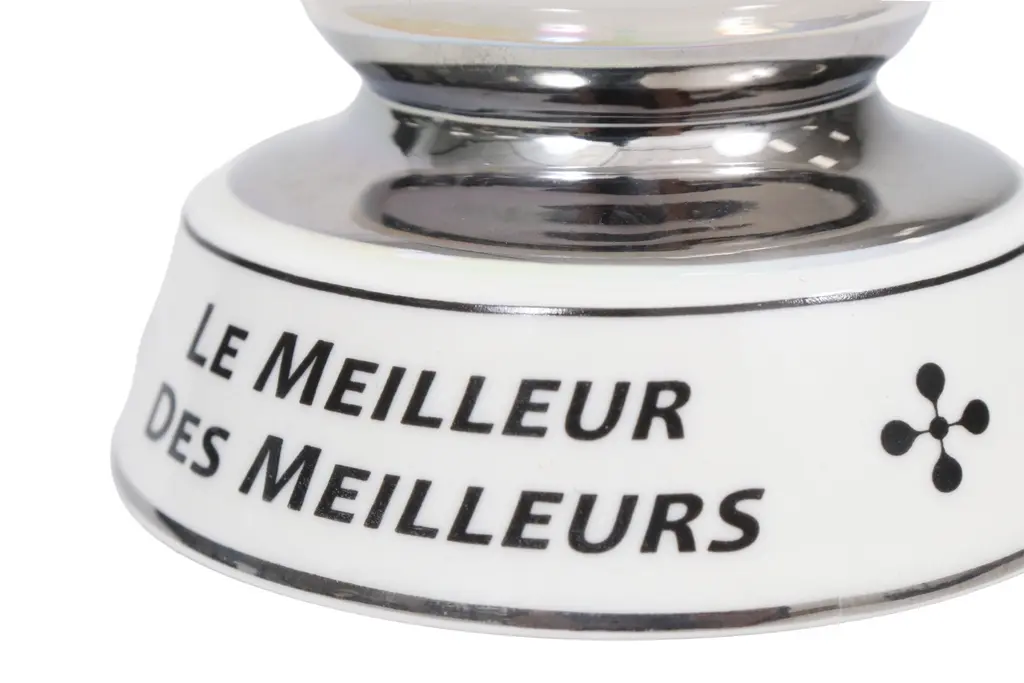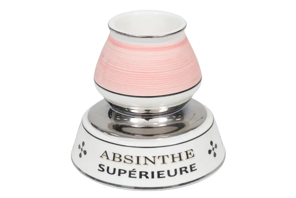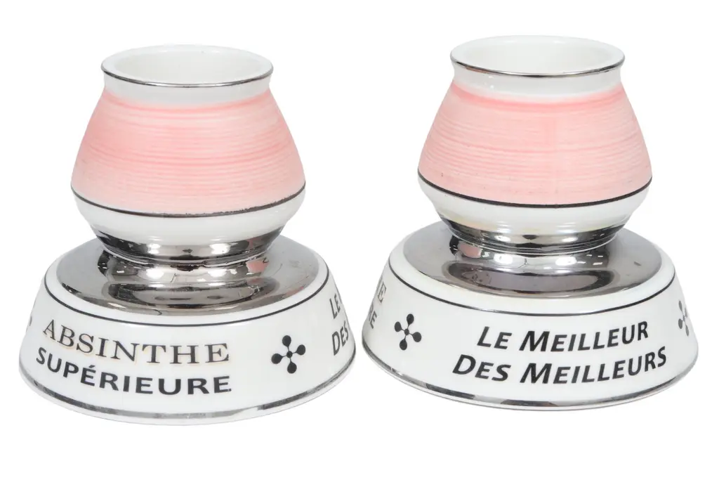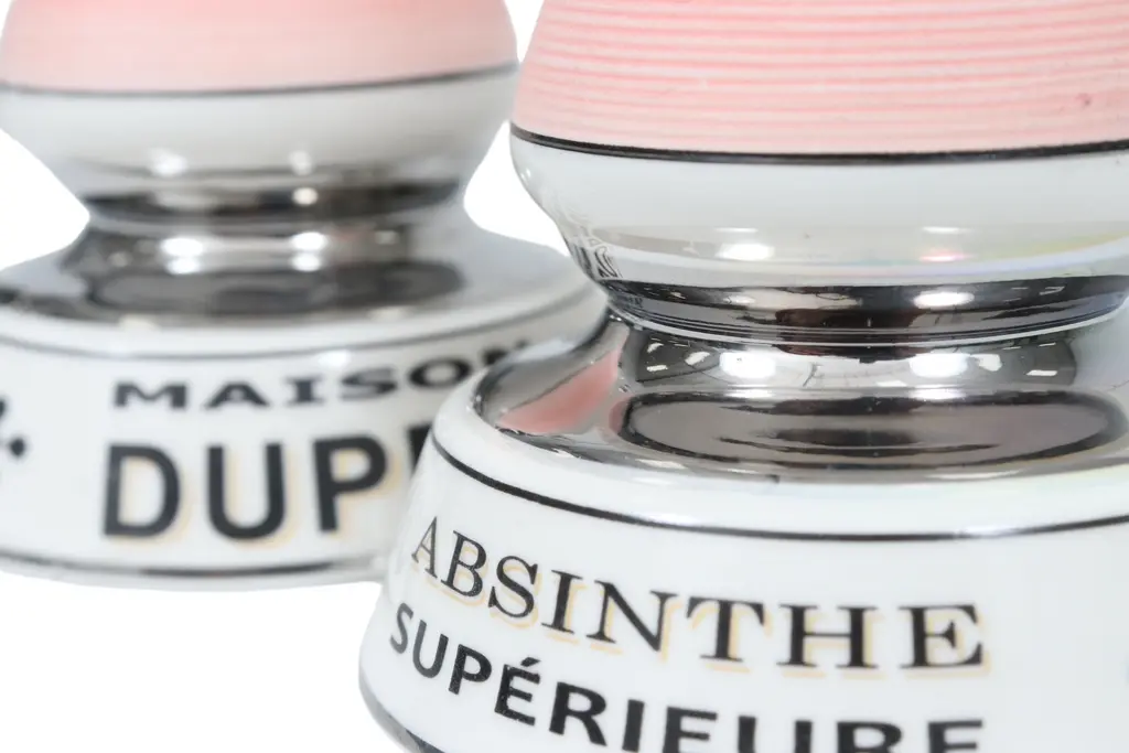 A pair of Parisian café ceramic match strikers and holders advertising Maison Dupre Absinthe. Reads "Maison Dupre, Absinthe Superieure, Le Meilleur Des Meilleurs" around the base. Dimensions per match striker.