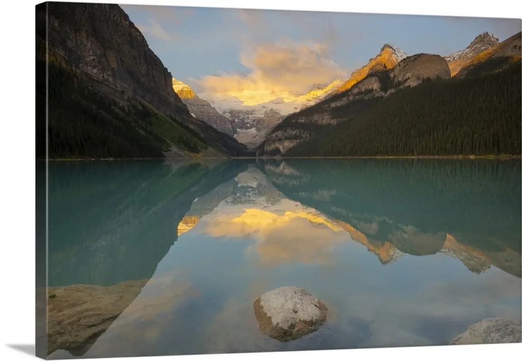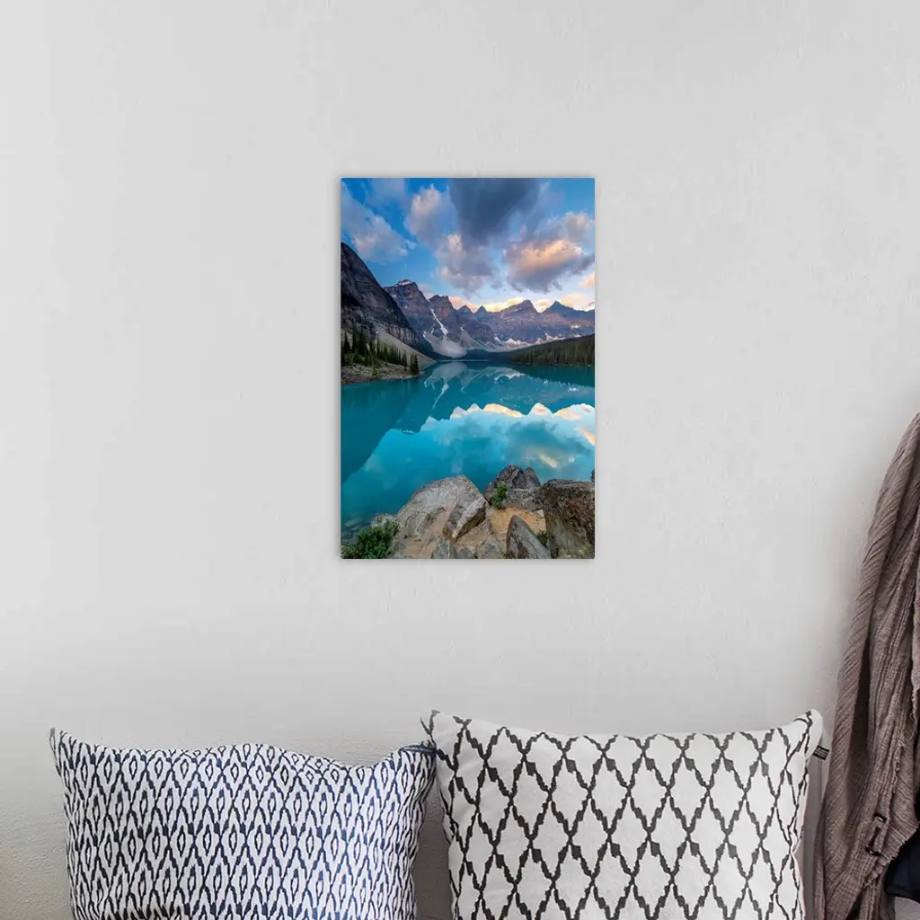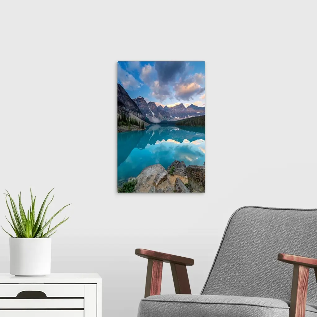 A sunrise refelection on Moraine Lake in the Canadian Rocky Mountains.