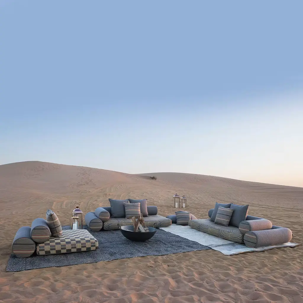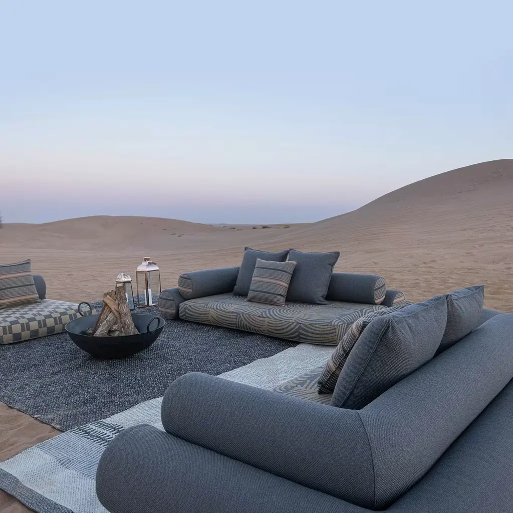 Majlis takes its name from a traditional space is use in Arab countries, dedicated to hospitability and conviviality. It is a modular seating system for outdoor use that features generous dimensions, rounded shapes and exceptional seating comfort. It is characterized by a large seat cushion embraced by two rolls that perform as the backrest, made in different sizes and densities. A breathable water-repellent fabric covers the insert. The price includes the decorative cushions, as shown in the image, and the protective cover for each module.