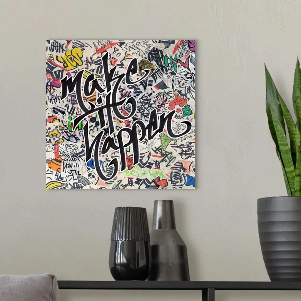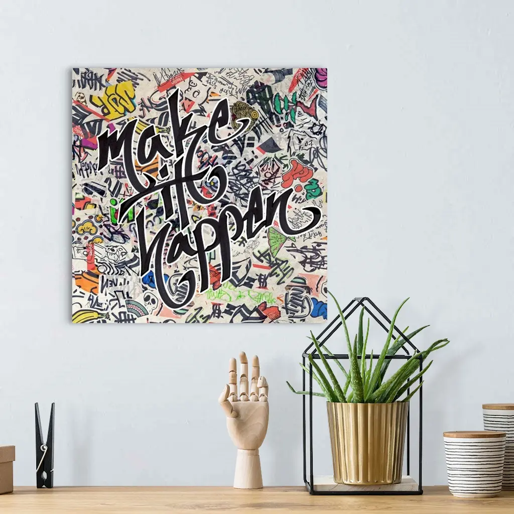 Graffiti-style lettering over a grunge background of pop stickers and symbols.