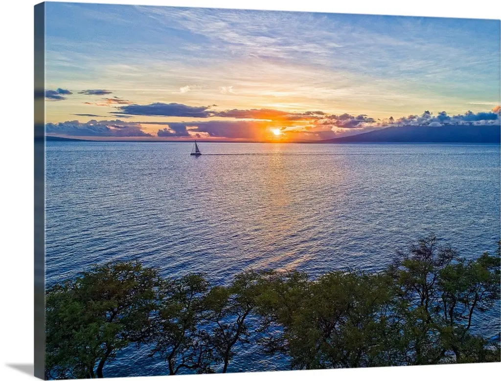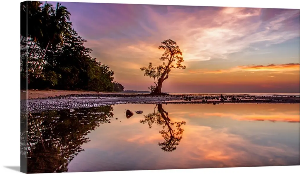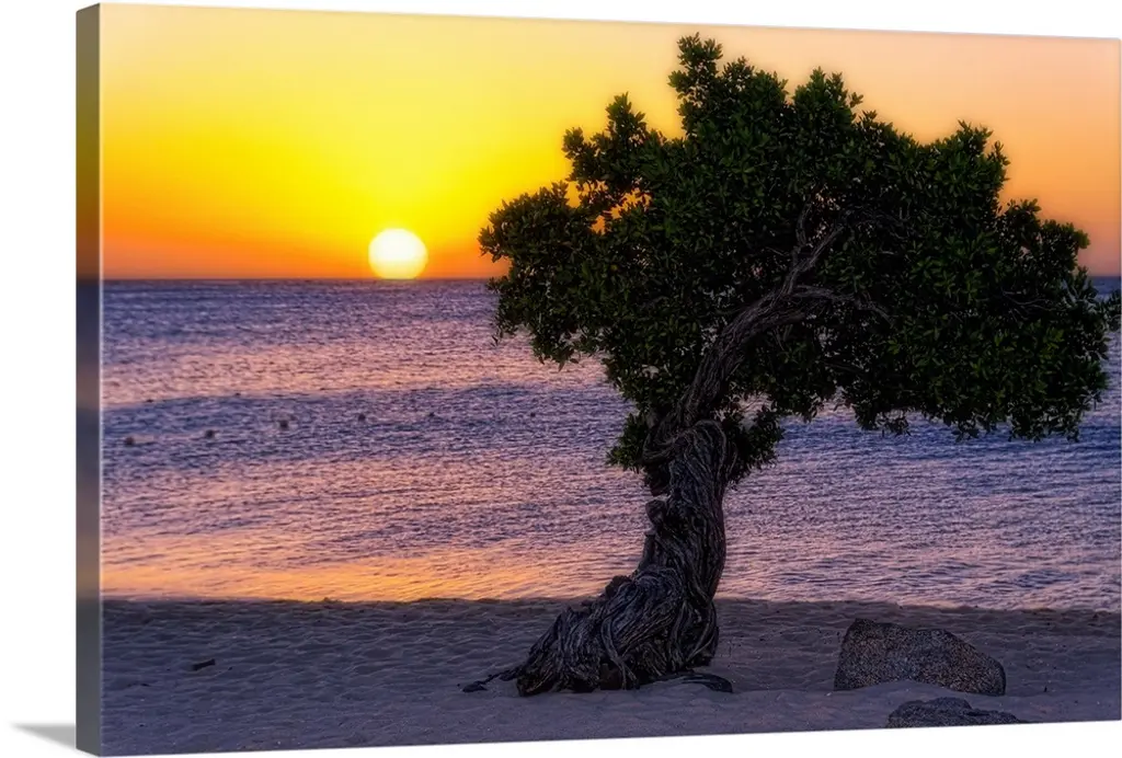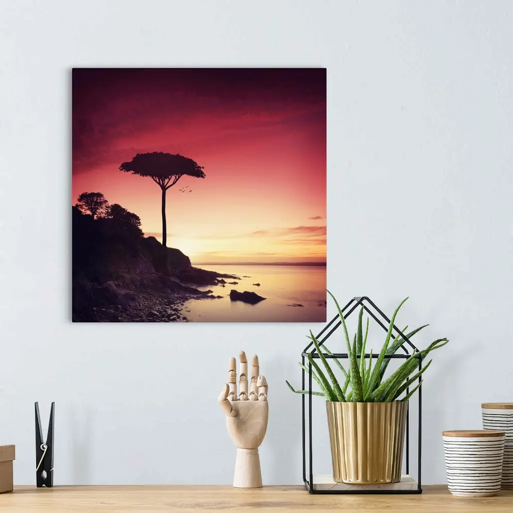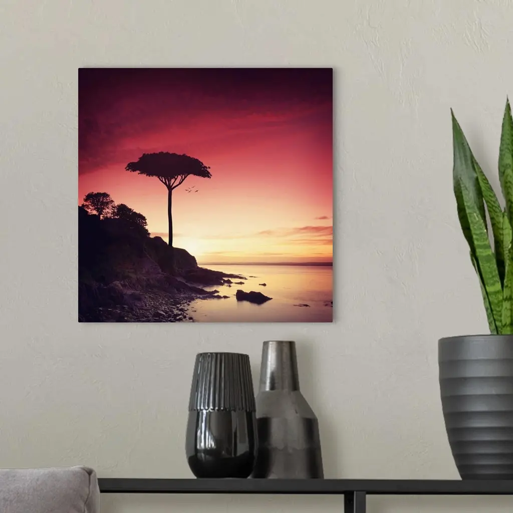 Photograph of a silhouetted lone tree on a rocky shoreline at sunset.