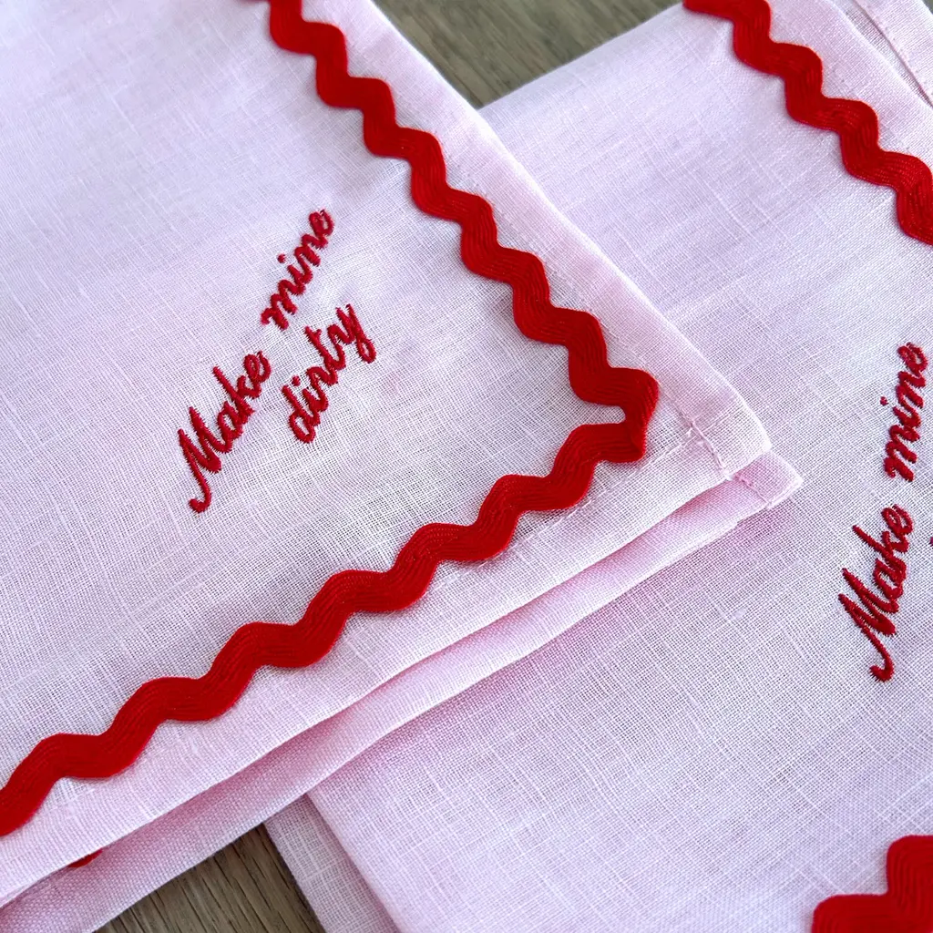 Add a touch of humor and vintage charm to your dinner parties with this embroidered "Make mine dirty" housewarming napkin set! Each 100% linen napkin features the cheeky phrase exquisitely embroidered along with decorative rick rack trim. A perfect mix of vintage and playful styles. Ideal for casual entertaining or a clever housewarming gift. The all-natural linen fabric lends a soft, absorbent texture.Set of 4