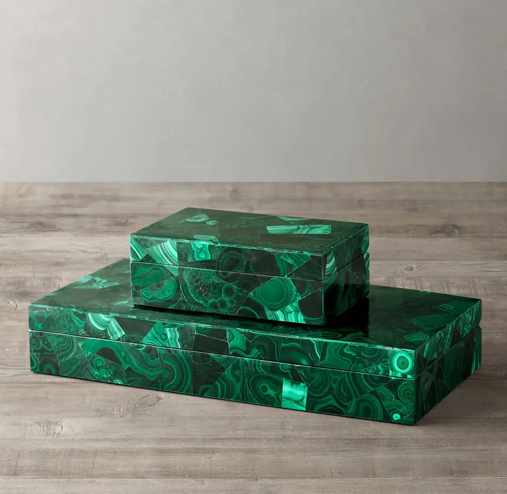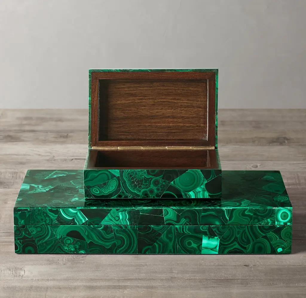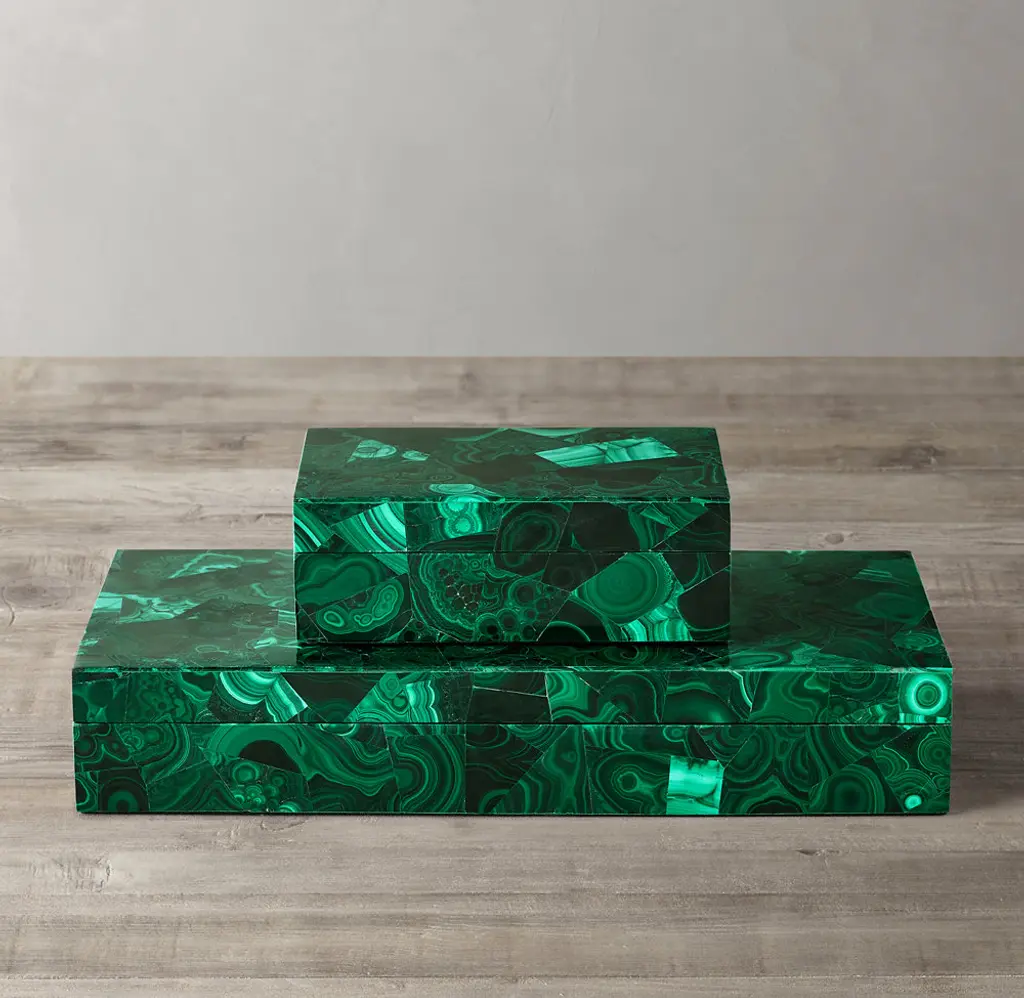 Natural malachite lends luxury to the simple form of our distinctive storage. Precision crafted and finished by hand, the vibrant green mineral features a silky luster and variegated pattern that reveal its natural beauty.