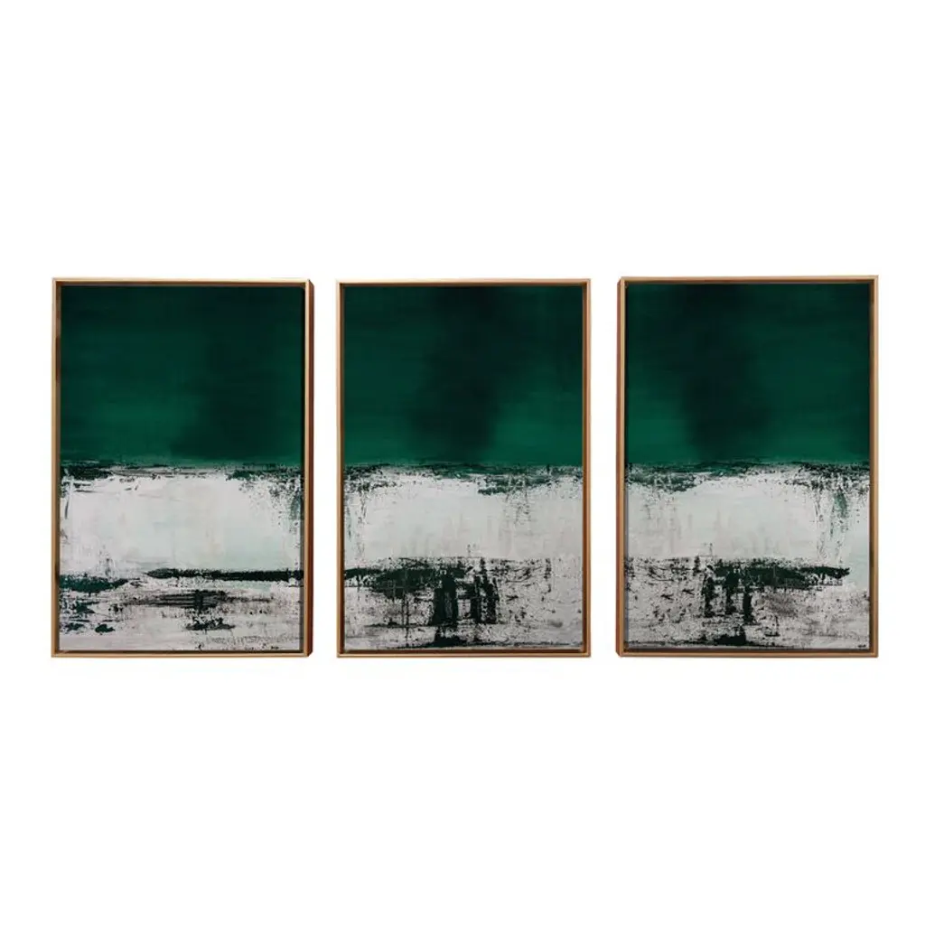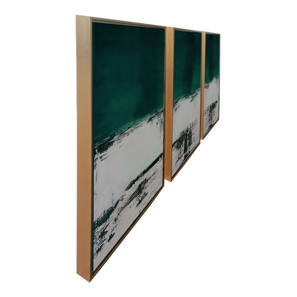 This framed canvas wall art triptych adorns any sizable wall in your home with bold, alluring color and artistic character. Floating in metallic gold frames, the trio of canvases are printed with deep malachite-green, white and black swaths of color. The continuous picture on this abstract wall decor set makes a stunning statement when displayed together.