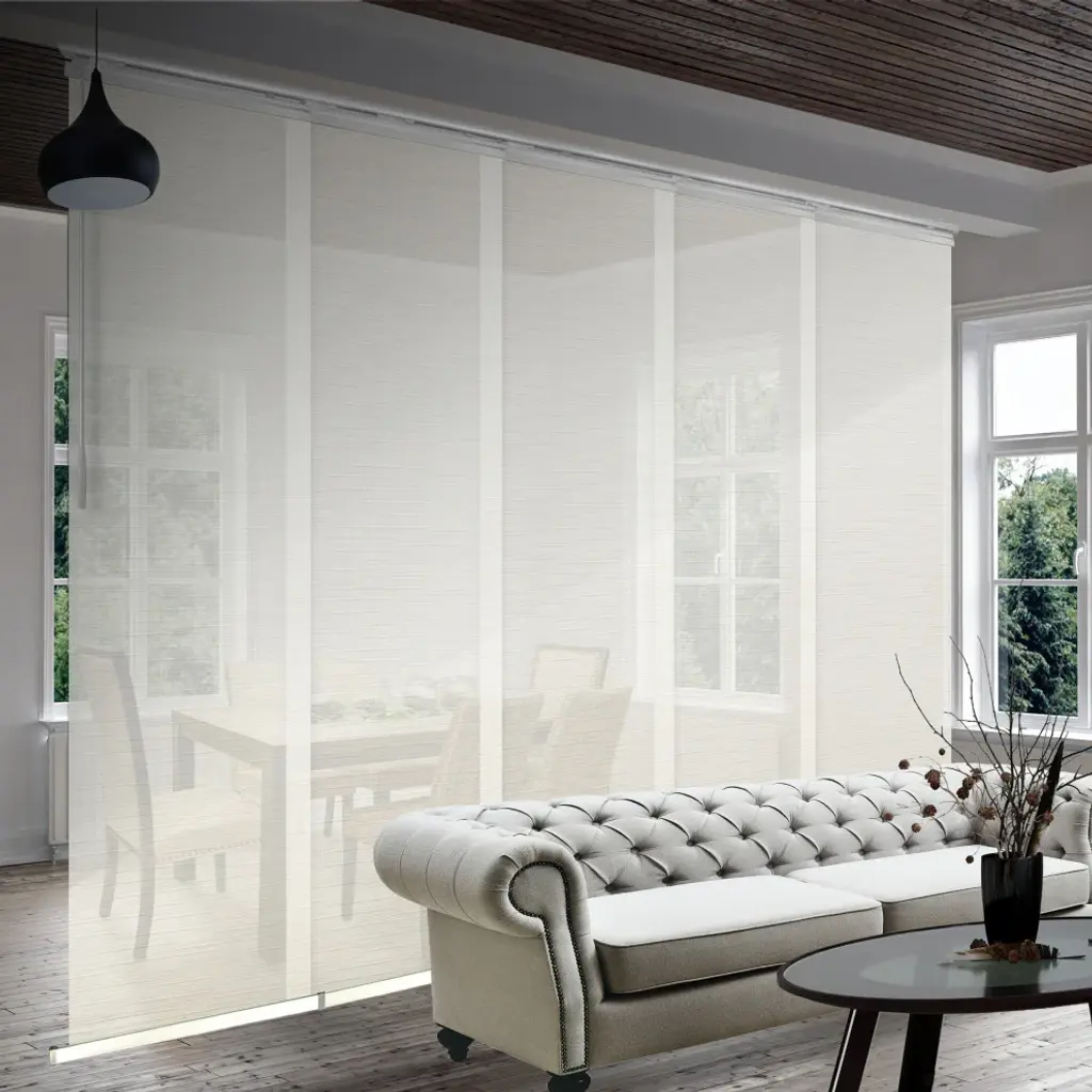 Central Design Products is pleased to introduce a new innovative panel track that offers easy 2-way installation, adding an alluring style and refined touch to your home decor. The single rail design of the track is sleek, compact, and reduces the overall footprint and weight of the installation, eliminating bulky, intrusive window treatments. Adjusting the panel height is a breeze � simply trim the panel, re-attach the liner, and install the panel weight. Detailed instructions are included.The panel track also features a patented slider design, made with aluminum and fitted with bearings that allow for durable and smooth operation. The sliders are stacked closer together than conventional panel tracks, reducing light bleed coming from the gaps between panels. This track has endless uses from dividing rooms, garages, offices, and closets to decorating windows and patios. Available in larger sizes including 8, 10, and 12 panels. Extends from 58-110� wide. Each panel measures 23.5" wide and 116" tall, with a total installation height of 118.5" (includes the 2.5" rail track). The track can be wall or ceiling mounted. The panels can stack on the left or the right. The clearance from the wall is extendable from 1.25� to 3.25� and projection from the wall is extendable from 3� to 4.25�. Malia panel is made from 69% Vinyl 31% Polyester, with a light filtering shade that blocks 50% of the light.