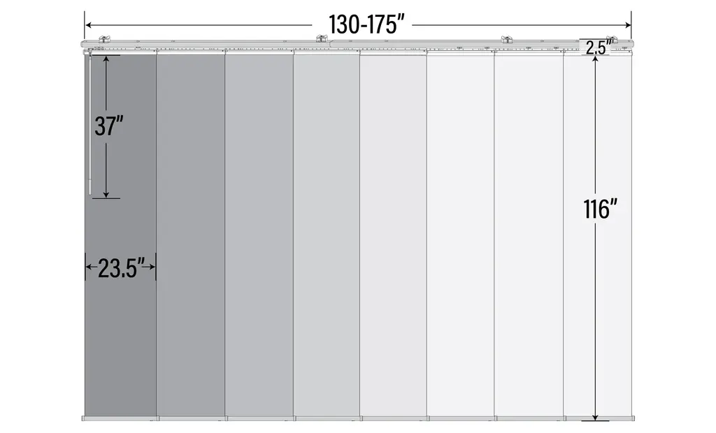 Central Design Products is pleased to introduce a new innovative panel track that offers easy 2-way installation, adding an alluring style and refined touch to your home decor. The double rail design of the track is sleek, compact, and reduces the overall footprint and weight of the installation, eliminating bulky, intrusive window treatments. Adjusting the panel height is a breeze � simply trim the panel, re-attach the liner, and install the panel weight. Detailed instructions are included.The panel track also features a patented slider design, made with aluminum and fitted with bearings that allow for durable and smooth operation. The sliders are stacked closer together than conventional panel tracks, reducing light bleed coming from the gaps between panels. This track has endless uses from dividing rooms, garages, offices, and closets to decorating windows and patios. Available in smaller sizes including 3, 4, 5, 6, and 7 panels.Extends from 130-175� wide.Each panel measures 23.5" wide and 116" tall, with a total installation height of 118.5" (includes the 2.5" rail track).The track can be wall or ceiling mounted.The panels can stack on the left or the right.The clearance from the wall is extendable from 1.25� to 3.25� and projection from the wall is extendable from 3� to 4.25�.Malia panel is made from 69% Vinyl 31% Polyester, with a light filtering shade that blocks 50% of the light.