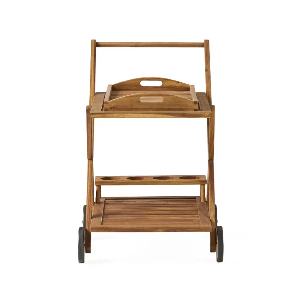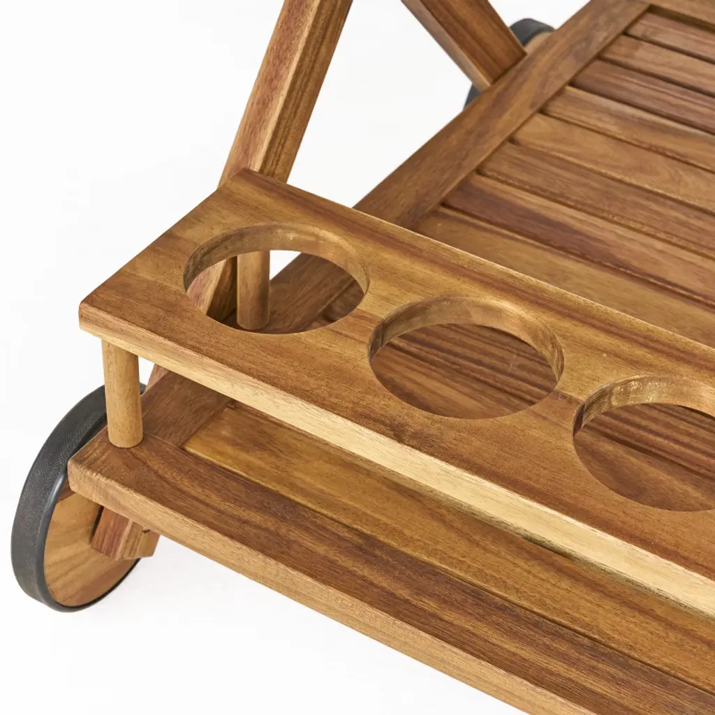 Elevate your hosting experience with the Riviera Bar Cart, crafted from premium natural acacia wood for timeless elegance and durability. This versatile mobile cart provides extra serving space or storage while its smooth-rolling wheels allow effortless repositioning—perfect for indoor/outdoor entertaining. The spacious design accommodates drinks, snacks, or decor, blending rustic charm with modern functionality.