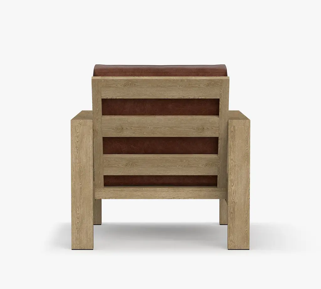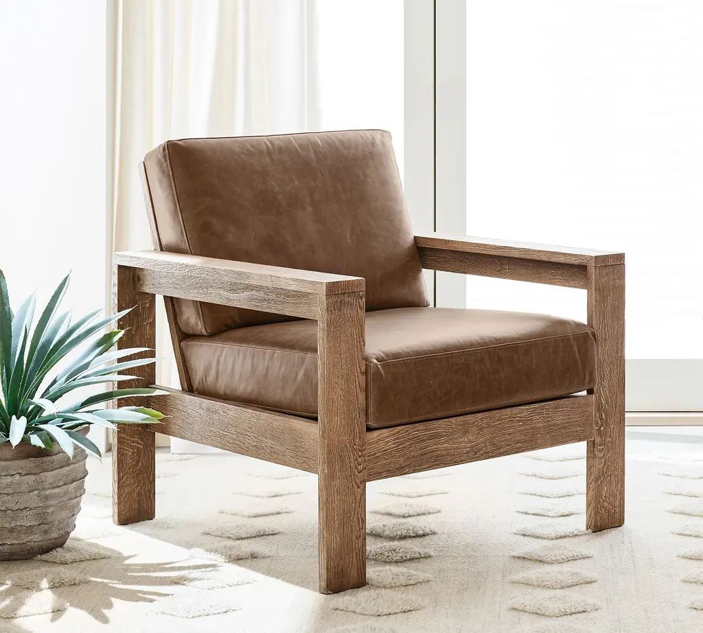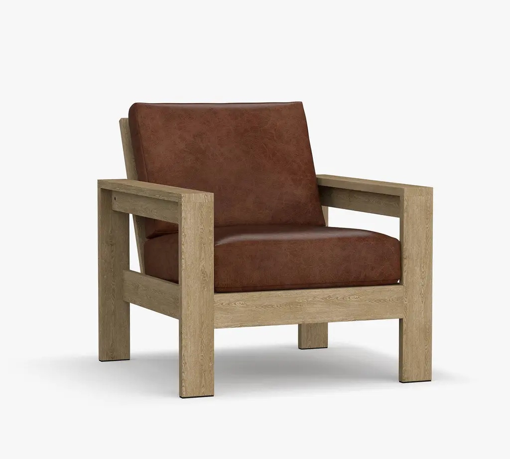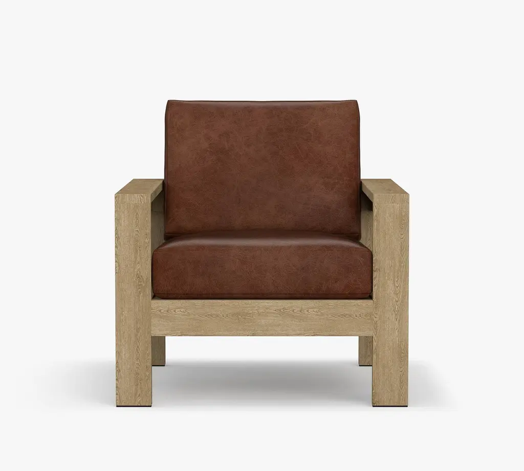 Clean, modern lines combine with a relaxed, rustic sensibility in this leather accent chair from our Malibu Collection. Meticulously crafted of wood, the versatile design features flat, wide arms that flow seamlessly into a cube silhouette. Thick seat and back cushions covered in rich leather provide a plush counterpoint to the rigorous geometry, inviting hours of comfortable lounging in your living area, study or bedroom.
