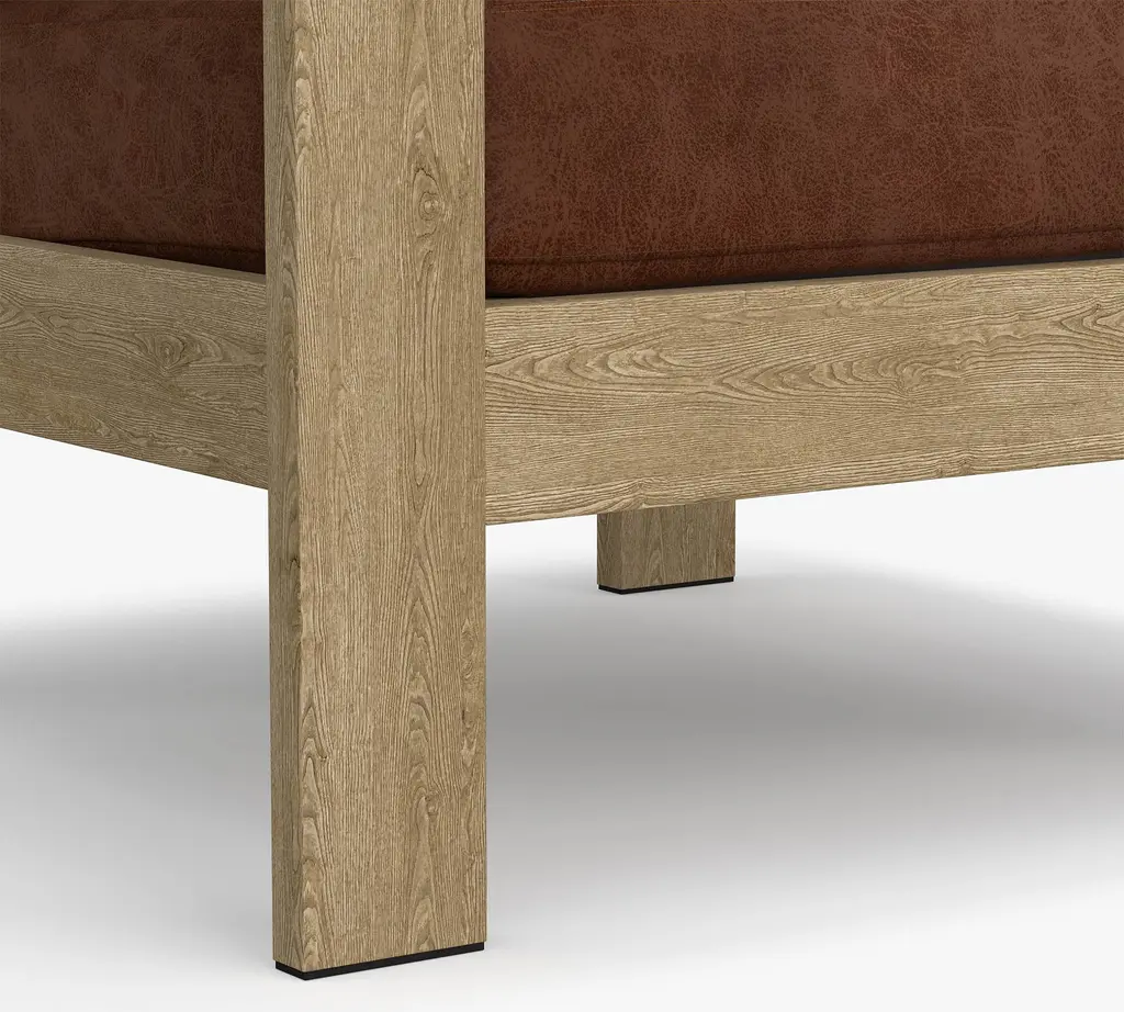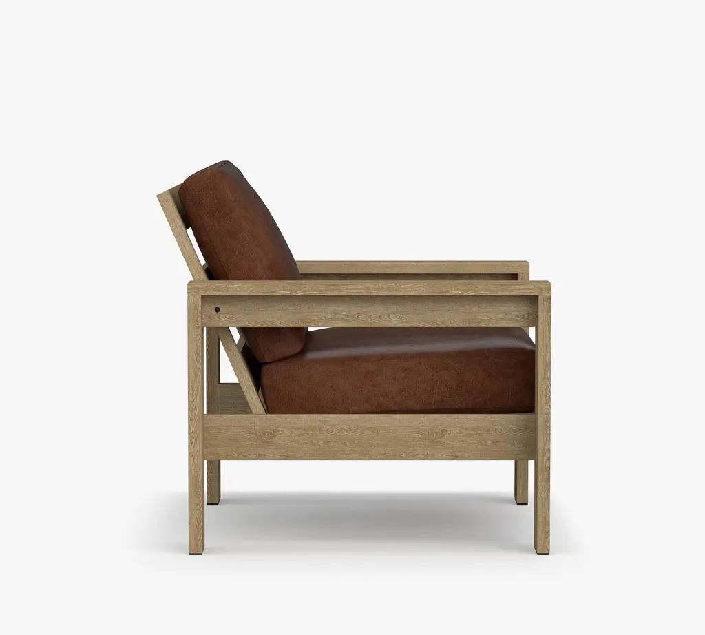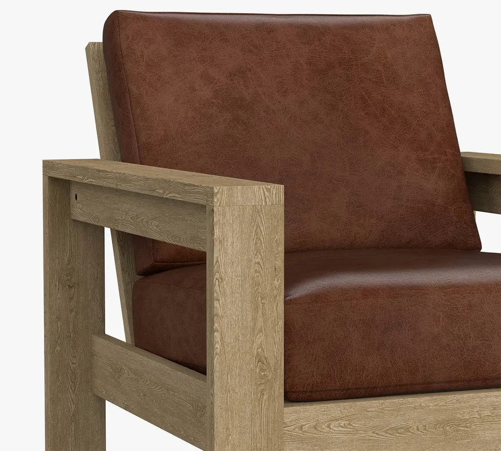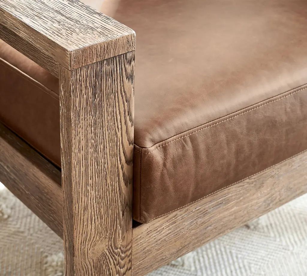 Clean, modern lines combine with a relaxed, rustic sensibility in this leather accent chair from our Malibu Collection. Meticulously crafted of wood, the versatile design features flat, wide arms that flow seamlessly into a cube silhouette. Thick seat and back cushions covered in rich leather provide a plush counterpoint to the rigorous geometry, inviting hours of comfortable lounging in your living area, study or bedroom.