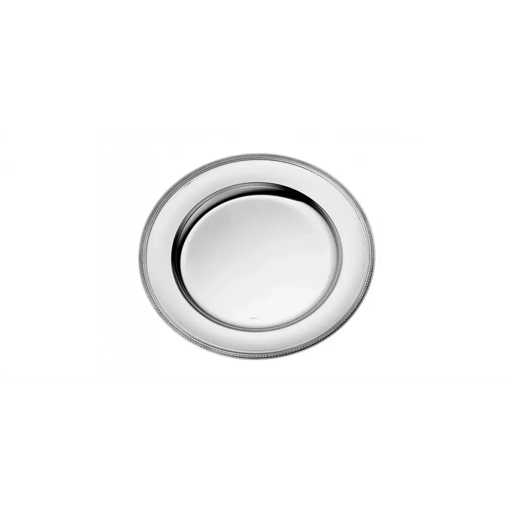 The extra large round silver plated tray in the Malmaison pattern can be used for serving entrees or beverage service. One of Christofle's most historic patterns, Malmaison typifies the Empire style, with its frieze of delicate palm and lotus leaves and symmetrical design. The name is a nod to the Chateau de la Malmaison, a favored Parisian residence of Napoleon Bonaparte and Empress Josephine. It is also the only line that includes a caviar service. Thanks to its creations in silver, Christofle is a symbol of luxury and elegance. Since its founding in the mid-19th century, it has been a continous innovative force and has infused each era with a new art of living. Thus, over time, this prestigious company has revolutionized styles, techniques, and methods for the production and distribution of silver plate and the decorative arts. A player in and privileged witness to the evolution of taste, customs, and traditions, Christofle has always seen its name associated with major creative trends, renowned artists such as Man Ray or Jean Cocteau, avant-garde architects such as Gio Ponti, and modernist silversmiths such as Lino Sabattini and Christian Fjerdingsatd, as well as present-day designers such as Andrée Putman, Martin Szekely or Ora ïto. Today, as in the past, whether gracing the tables of emperors, princes, or maharajas, in palaces, on board the Trans-Siberian Railway, Orient Express, or transatlantic ocean liners, or in the contemporary restaurants, Christofle continues to make an impression.
