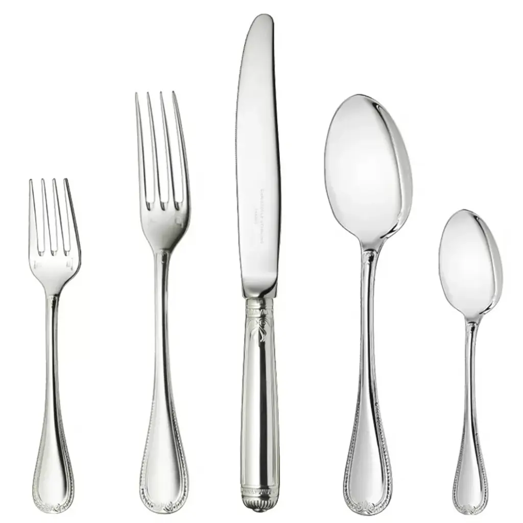 One of Christofle's most historic patterns, Malmaison typifies the Empire style, with its frieze of delicate palm and lotus leaves and symmetrical design. The name is a nod to the Chateau de la Malmaison, a favored Parisian residence of Napoleon Bonaparte and Empress Josephine Launched in 1967, the frieze of delicate palm & lotus leaves decorating the flatware are typical of the Empire style. Thanks to its creations in silver, Christofle is a symbol of luxury and elegance. Since its founding in the mid-19th century, it has been a continous innovative force and has infused each era with a new art of living. Thus, over time, this prestigious company has revolutionized styles, techniques, and methods for the production and distribution of silver plate and the decorative arts. A player in and privileged witness to the evolution of taste, customs, and traditions, Christofle has always seen its name associated with major creative trends, renowned artists such as Man Ray or Jean Cocteau, avant-garde architects such as Gio Ponti, and modernist silversmiths such as Lino Sabattini and Christian Fjerdingsatd, as well as present-day designers such as Andrée Putman, Martin Szekely or Ora ïto. Today, as in the past, whether gracing the tables of emperors, princes, or maharajas, in palaces, on board the Trans-Siberian Railway, Orient Express, or transatlantic ocean liners, or in the contemporary restaurants, Christofle continues to make an impression.