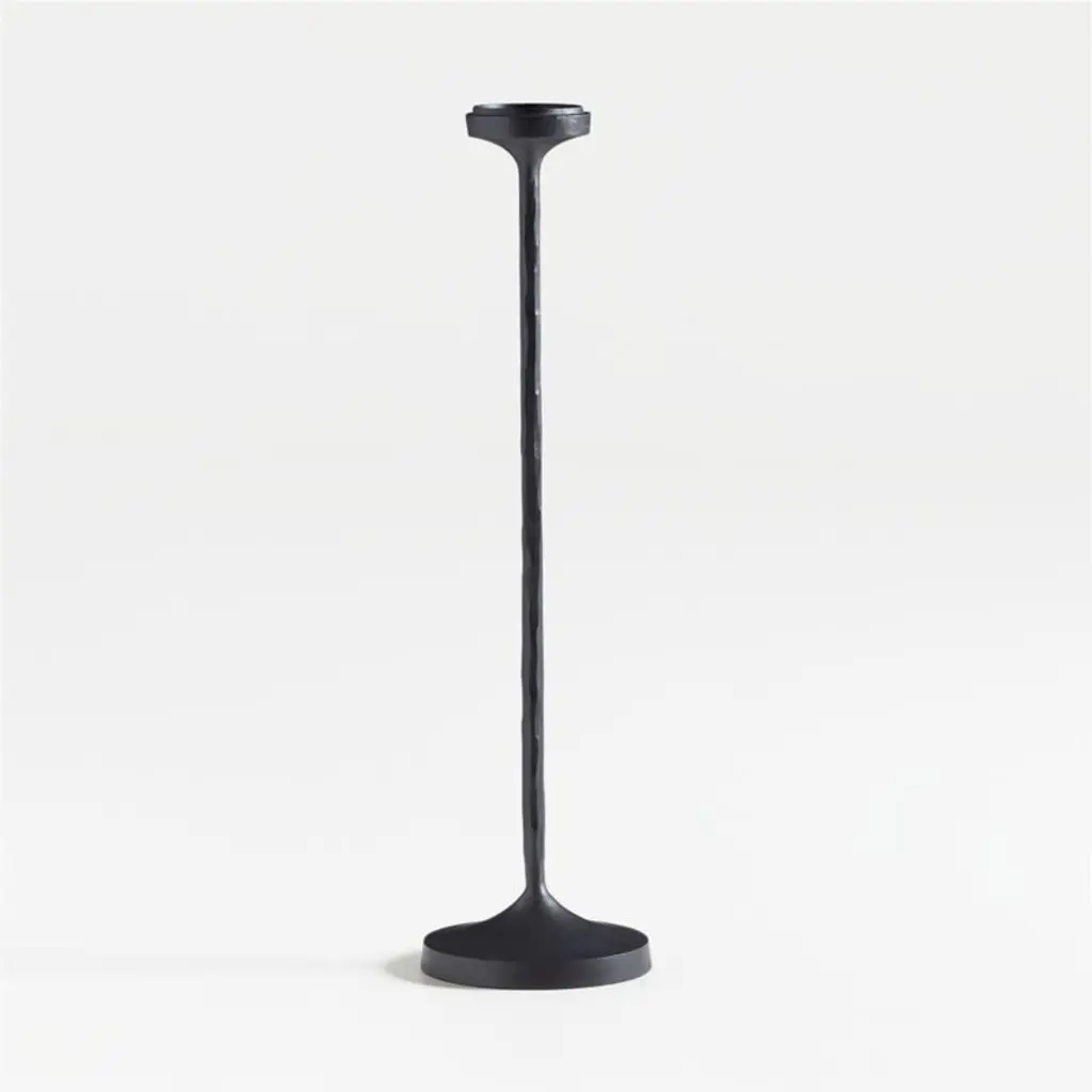 Our freestanding Maloy floor candle holder graces any spot in the home with atmospheric illumination and a touch of drama. Hand-hammered by skilled craftspeople, the black iron stand stretches a slender stem from a sturdy base to a platform top that accommodates taper and pillar candles. We love Maloy's unique texture and timeless presence in an entryway, hallway or any corner that could use an eye-catching accent.