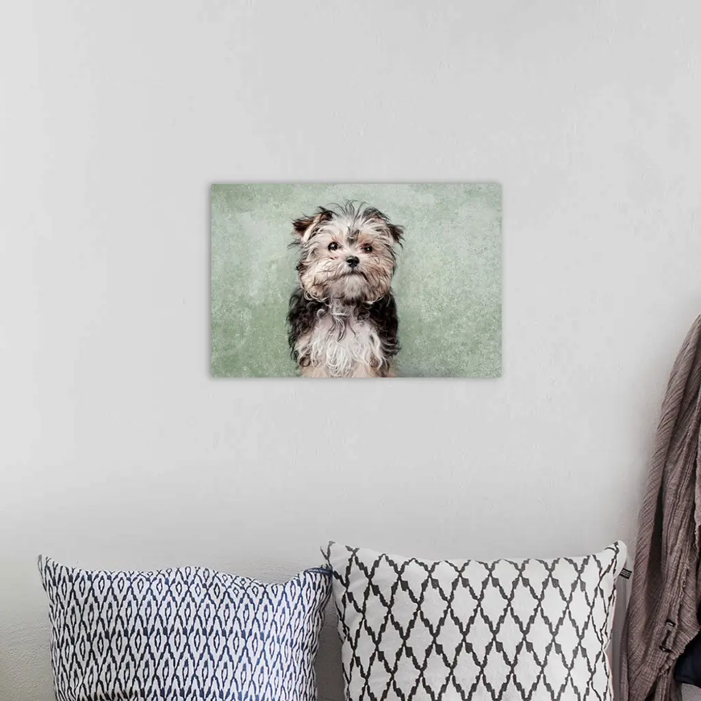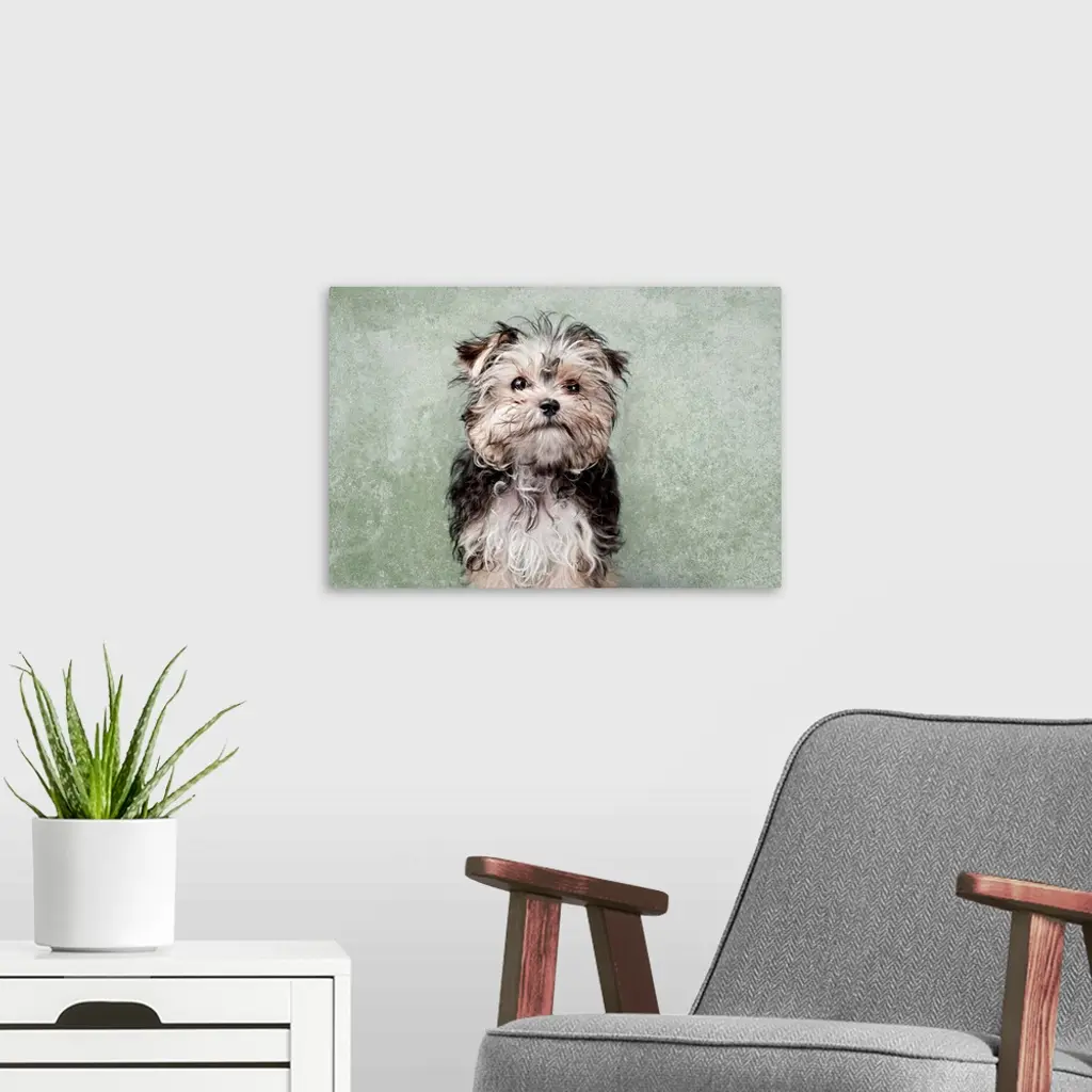 Maltese yorkshire terrier mix on green textured background. wall art for home and office decor. Discover canvas art prints, photos, mural, big canvas art and framed wall art in GreatBigCanvas.com's varied collections.
