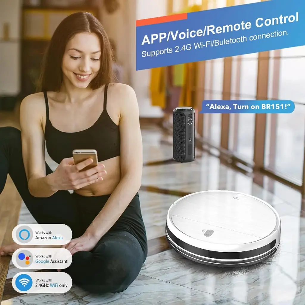 BR151 Robot Vacuum Cleaner and Mop Combo,Let's make cleaning easier. MAMNV smart robot vacuum and mop is an effective way to freed you from the rather boring household chores,allowing you spend more time with your family members,or concentrate your energy on your work. Compatible with APP You can control the smart robot vacuum through APP or voice commands, arrange and monitor cleaning, set cleaning modes and customize cleaning, and know the vacuum malfunction cause with your phone. Warm Notice: The APP only supports 2.4 GHz WiFi, which is compatible with Android and Apple. Please update the latest version of the app in time when you receive the robot vacuum. Z-shape Route, High Coverage This robot vacuum cleaner defaults to a random cleaning path. The zigzag cleaning can be selected through the remote control or APP. Z-type routing has high coverage, less missed scanning and high efficiency. (When using, please pay attention to avoid collision of the robot vacuum cleaner, otherwise it will change the Zig-zag Cleaning cleaning path.) Automatic Charging The battery life of the Automatic robot vacuum clean is 100 minutes. When the battery is low or cleaning is complete, it will automatically return to the charging station. The infrared sensor of the robotic vacuum cleaner can search and sense the charging base at a distance of 60 to 80 in. It will first enter the random search mode for 5 mins. If it is not detected, it will enter the Yanbian mode search for 20 mins. Vacuuming + Mopping =BR151 Robotic Vacuum